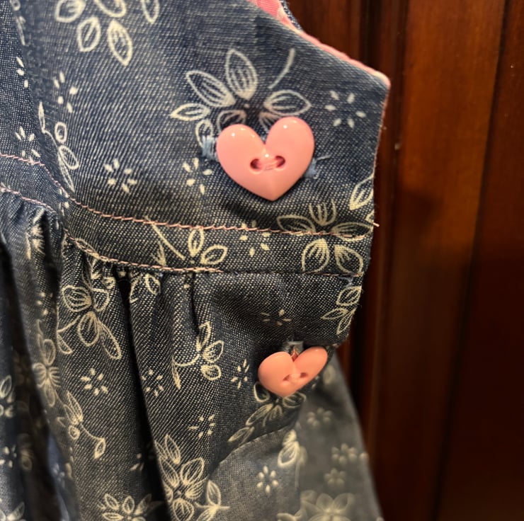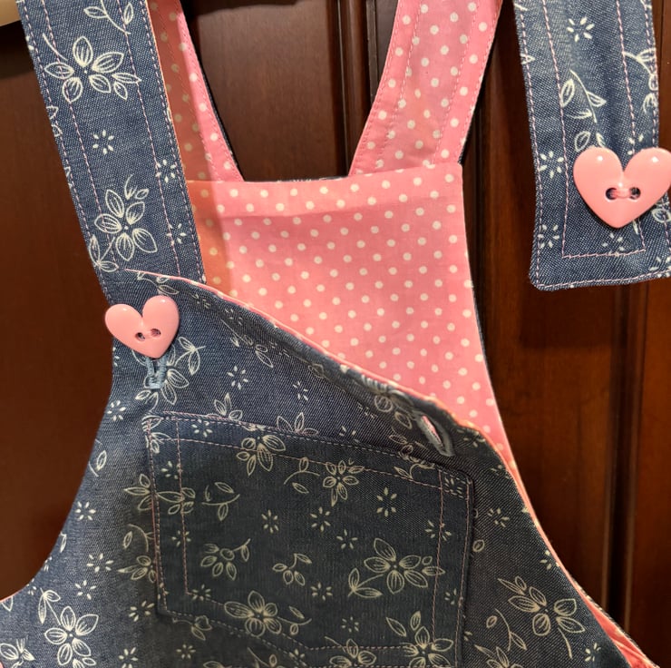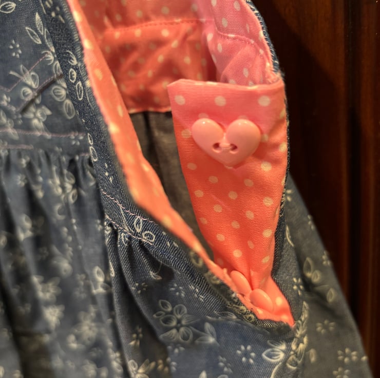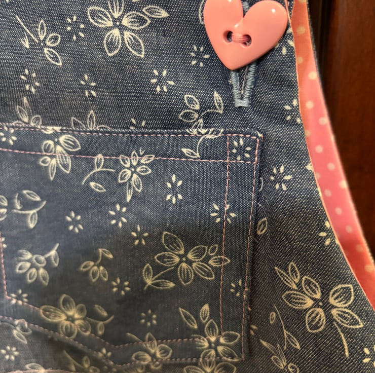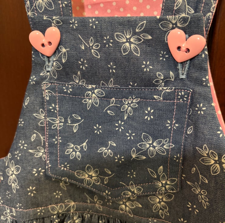 The facings are in a pink polka dot print, giving a lovely contrast to the denim.