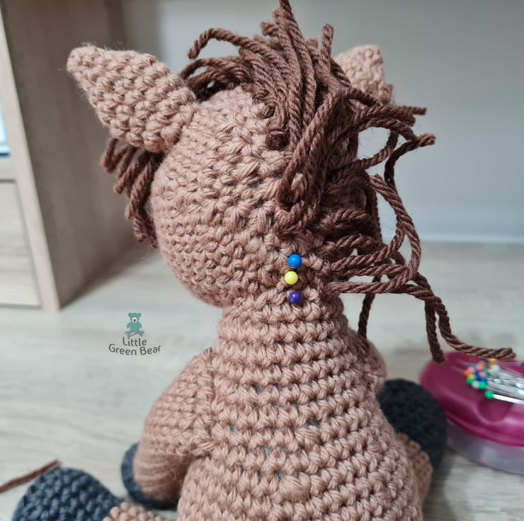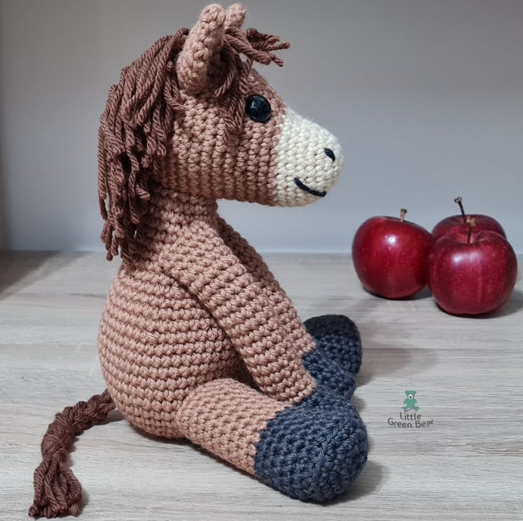 Harrold the horse loves galloping around the paddock and lazing in the sun with a belly full of scrumptious apples. He sits 9 inches tall (when made with the recommended materials).