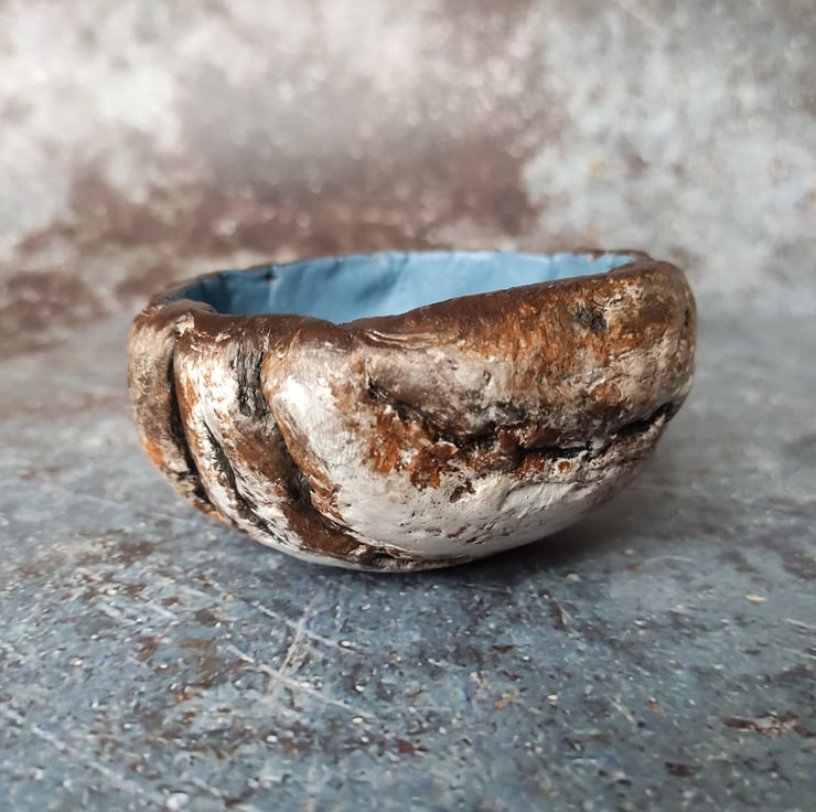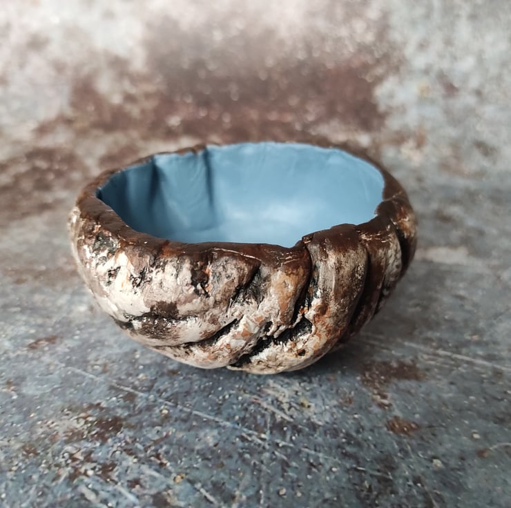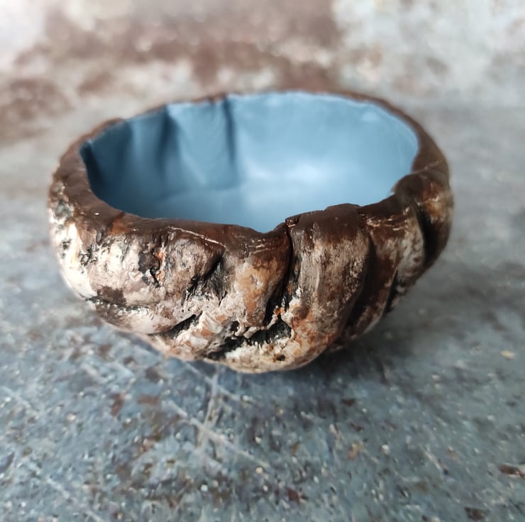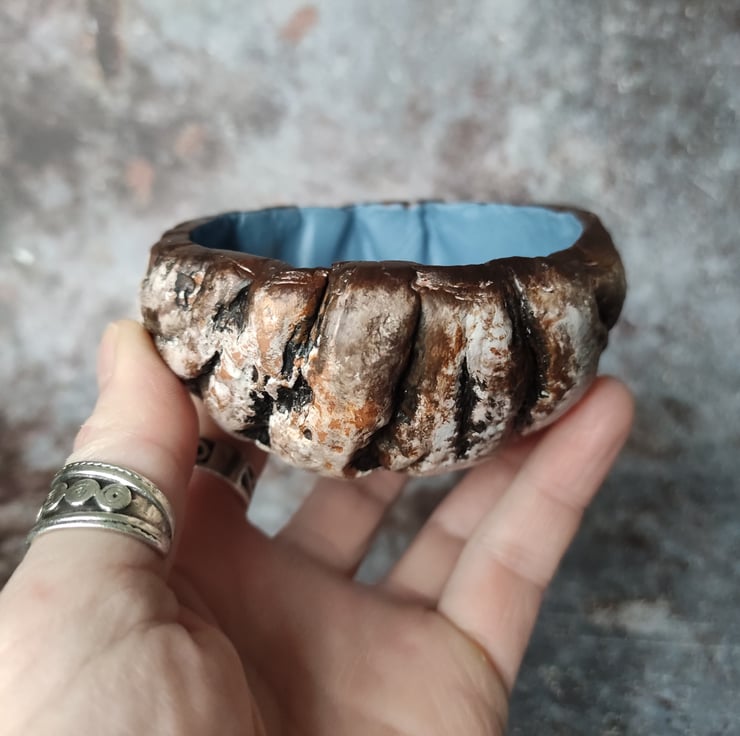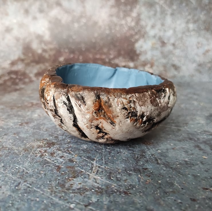 Another of my silver birch bark inspired rustic textured wabi sabi clay bark bowls with a storm cloud blue interior. A truly unique gift for those craving a simple nature inspired décor!