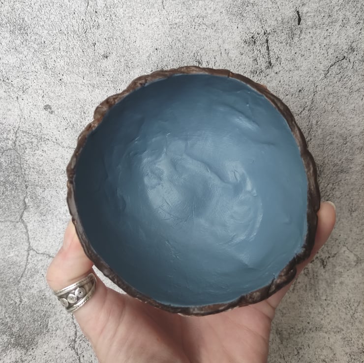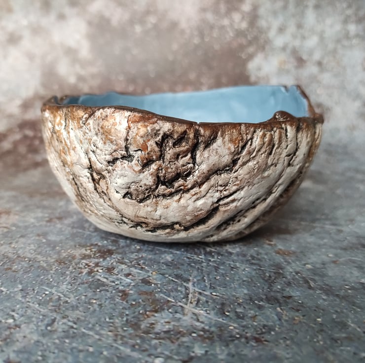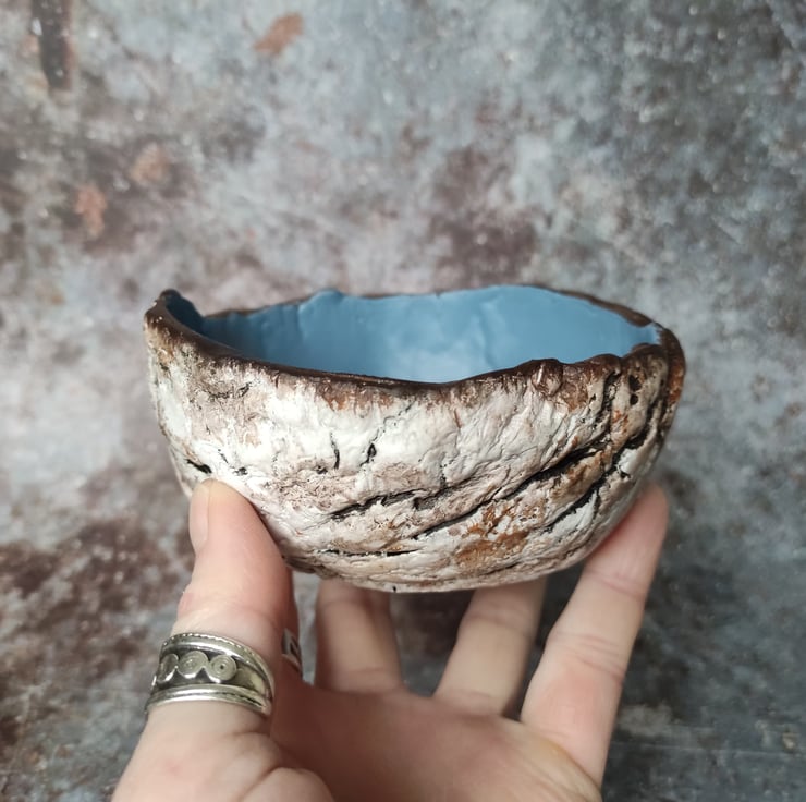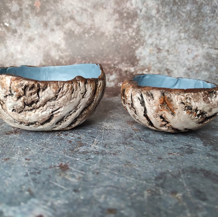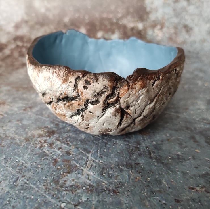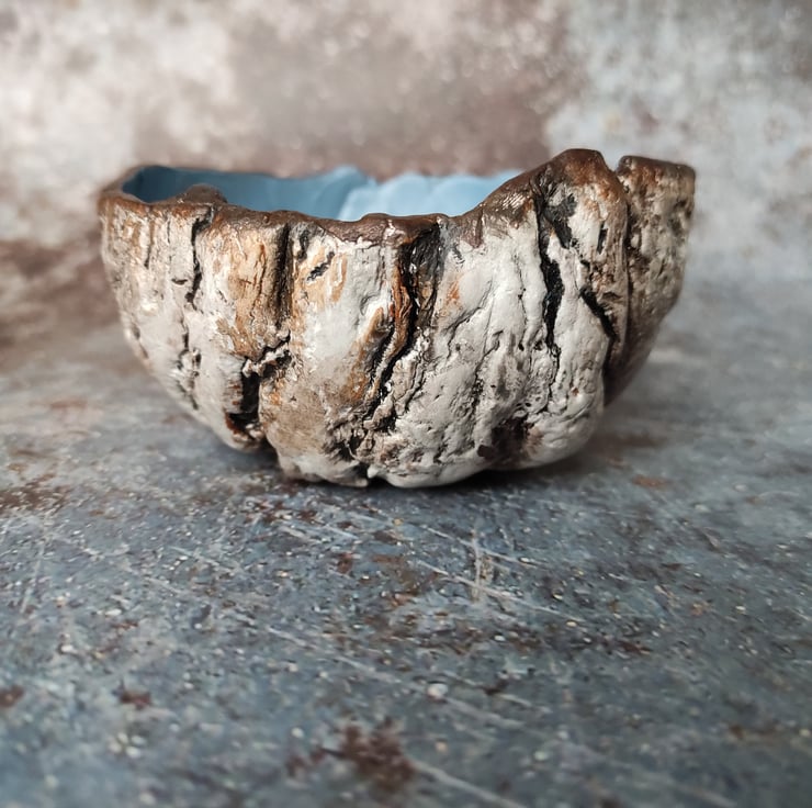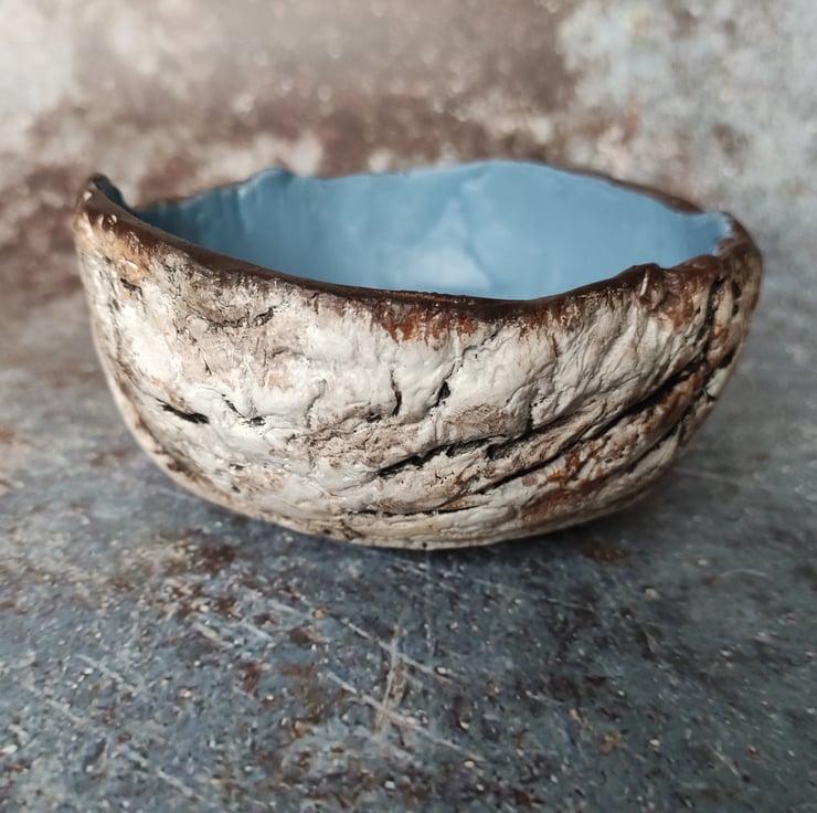 Another of my silver birch bark inspired rustic textured wabi sabi clay bark bowls with a storm cloud blue interior. A truly unique gift for those craving a simple nature inspired décor!