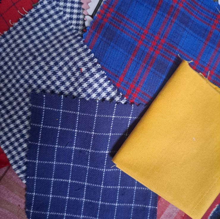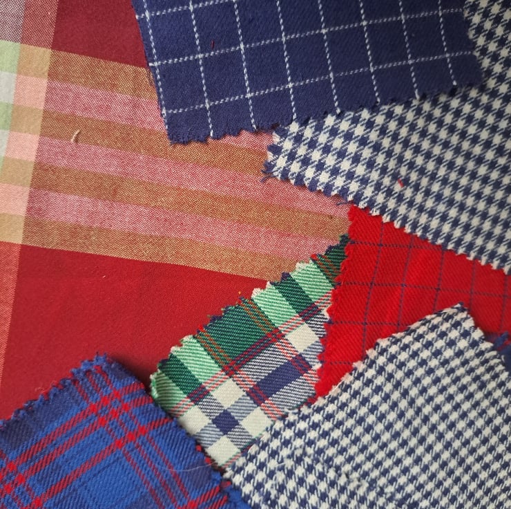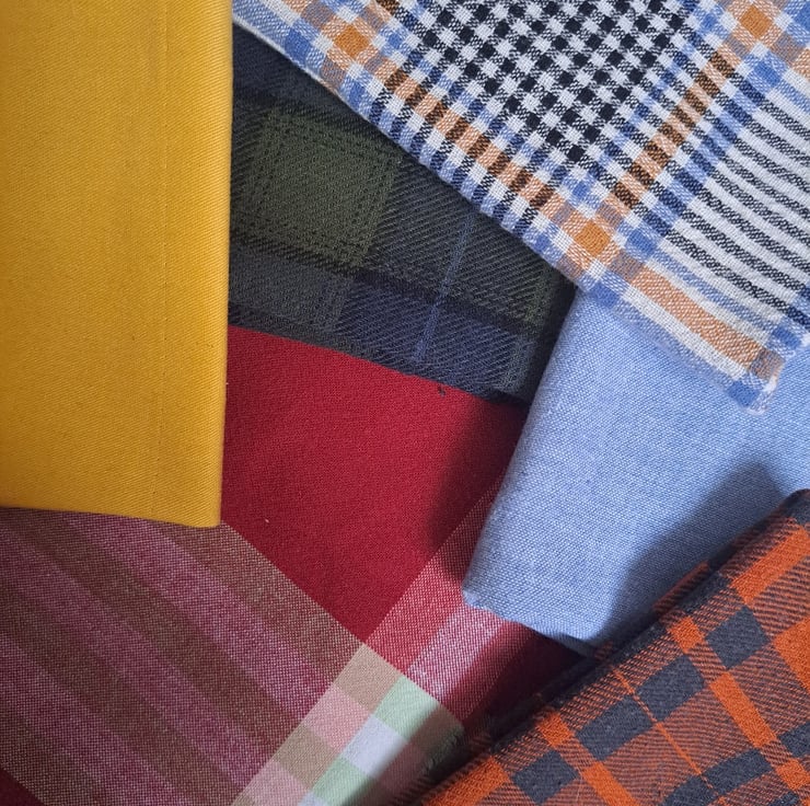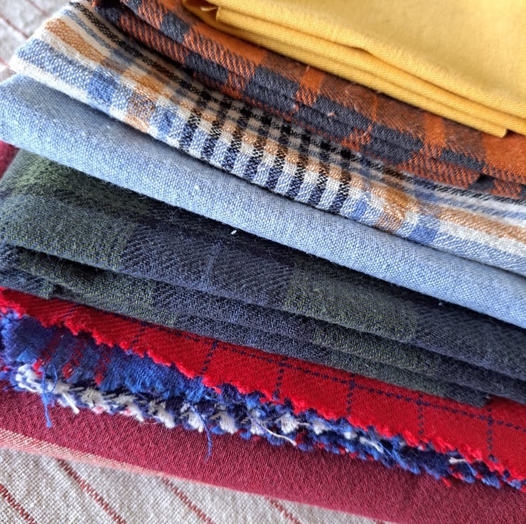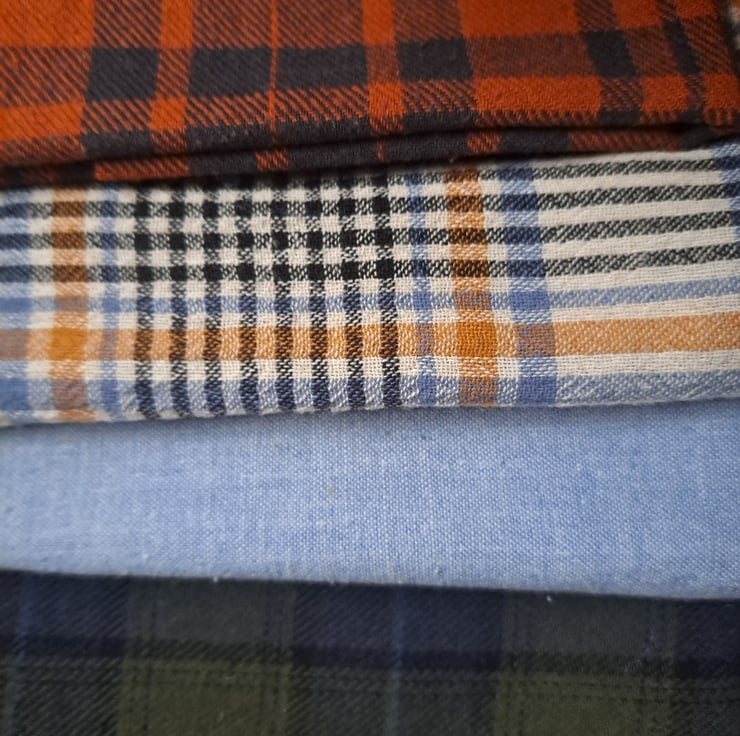 A robust, fresh-air-loving, campfire kind of bundle full of checks, flannel and chambray - what's more one of the pieces was once part of a very nice pair of cotton shorts. Approximately 18 assorted pieces, including 12 cotton flannel squares measuring 12.12cm.