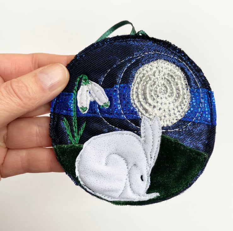 This adorable embroidered hare home decorations shows a sleeping hare under the full moon beside a snowdrop. It has been made from up-cycled fabrics and stitched down with free motion embroidery. It comes felt backed and measure approx 9.5cm diameter, with the ribbon the length is 19cm.