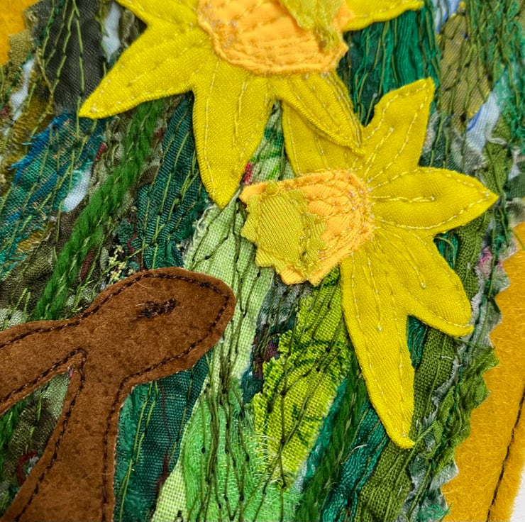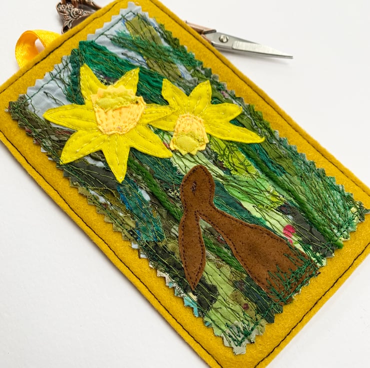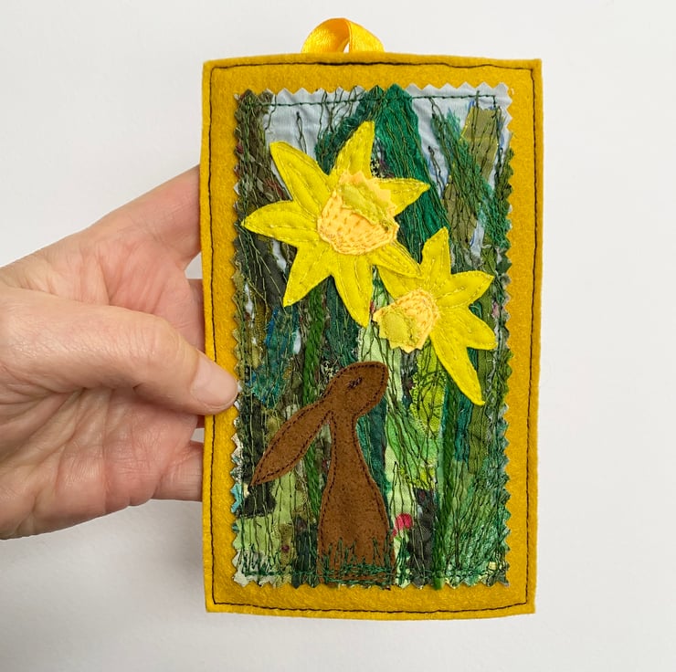 This adorable embroidered rabbit home decorations shows a rabbit enjoying the sweet smell of spring daffodils. It has been made from up-cycled fabrics and stitched down with free motion embroidery. It comes felt backed and measure approx 9.5 x 16cm, with the ribbon the length is 20cm.