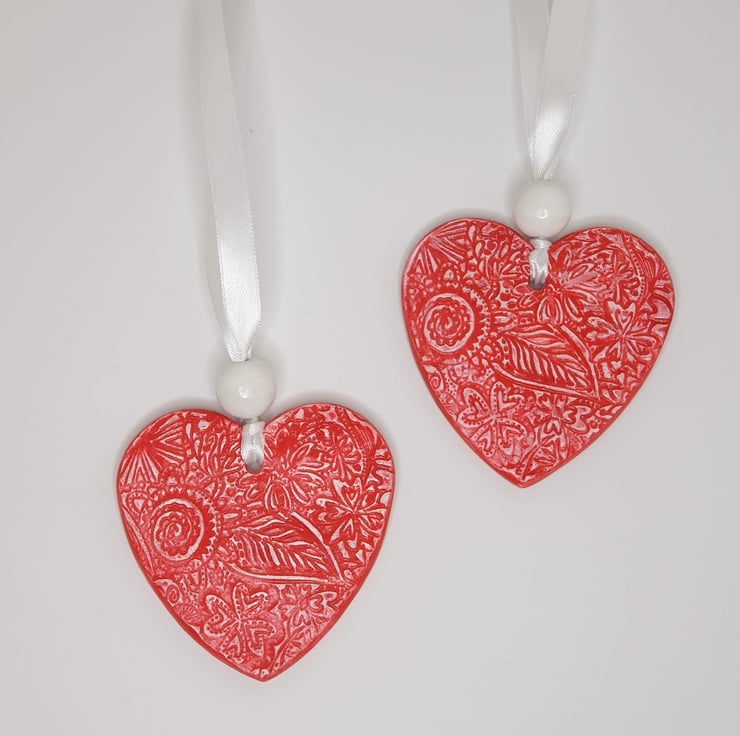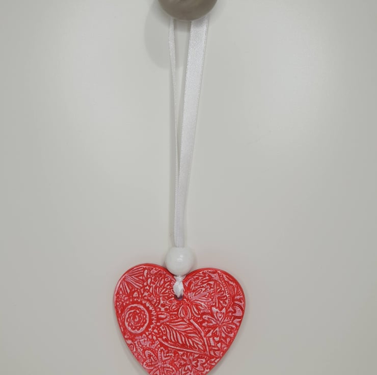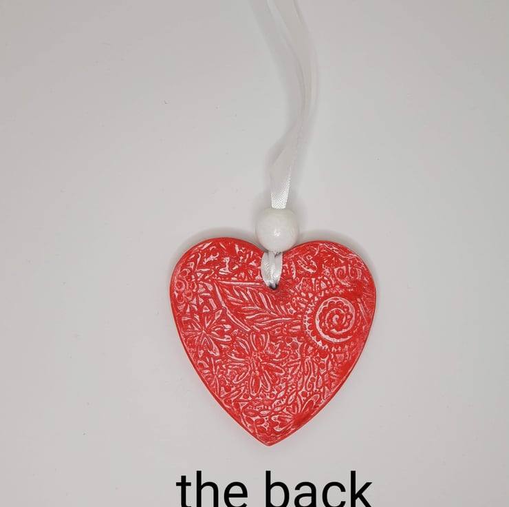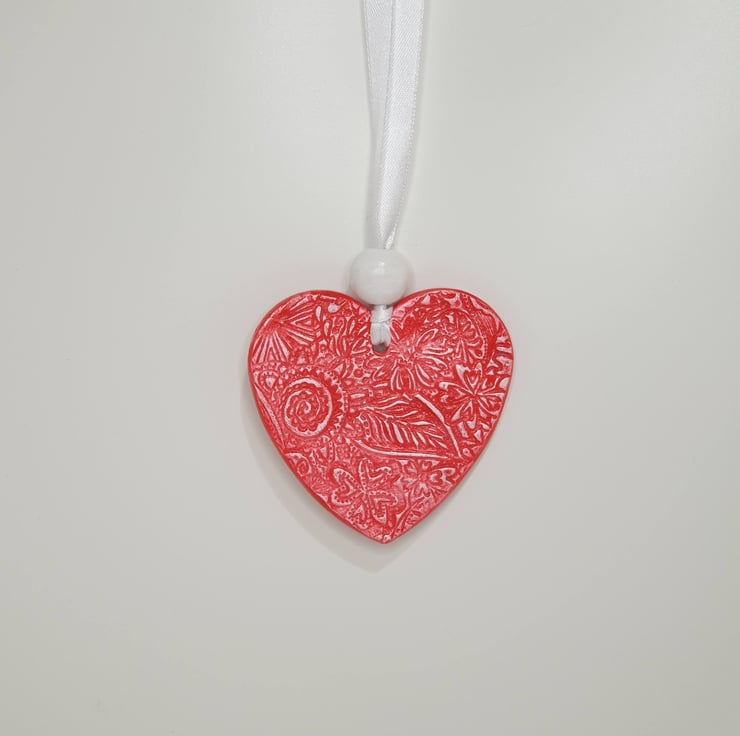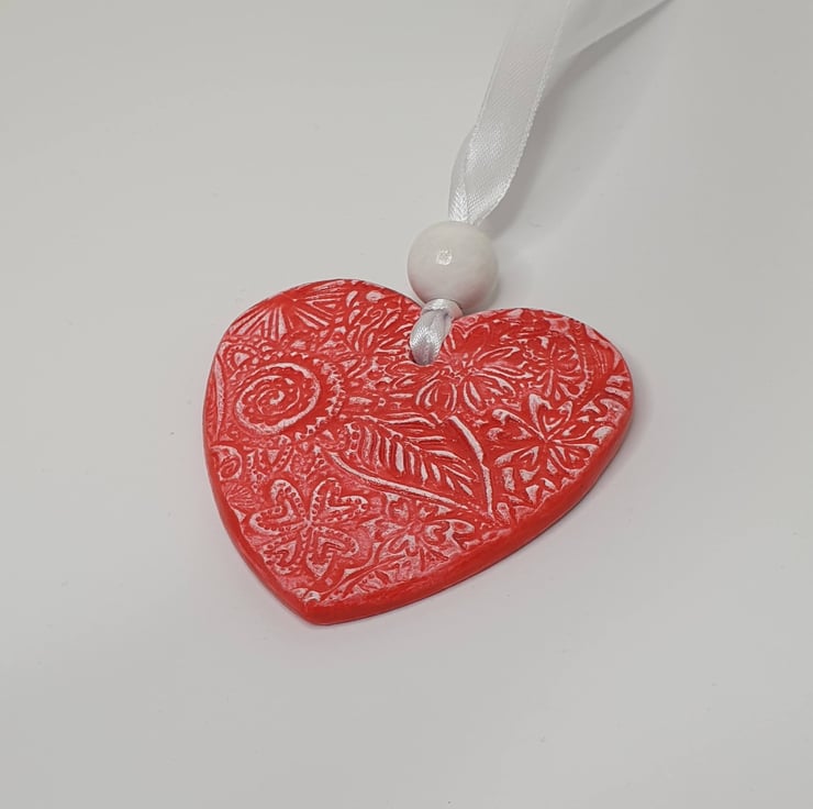 Pretty red and white clay hanging heart decoration which has been lovingly created from air dry clay and imprinted on both sides with a floral pattern. The heart has been coloured with red acrylic paint and finished with internal varnish.