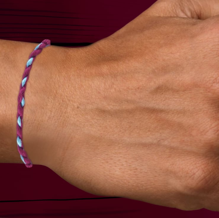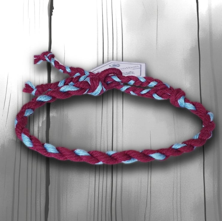 Claret and baby blue coloured handmade twisted team colours bracelet. Made with quality embroidery thread. Can be kept clean washing by hand with a little washing powder, rinse thoroughly and leave to dry.