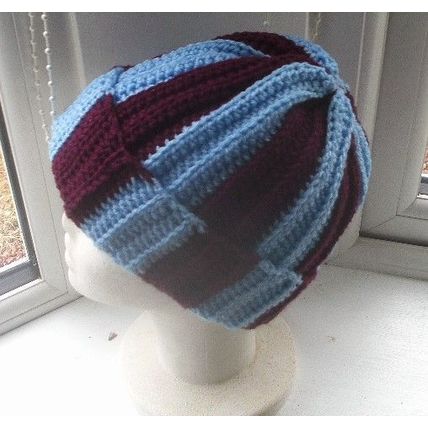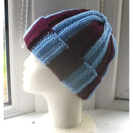 Handmade crochet ribbed beanie hat in claret & blue stripes.