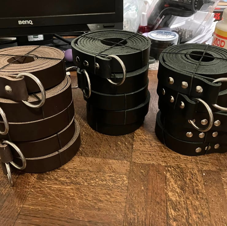 Leather weight is a firm 3-4 oz. Ring is 1.5” width and nickel plated. These belts are long enough to wrap around once, in some cases twice (depending on the build of the person using said belt).
