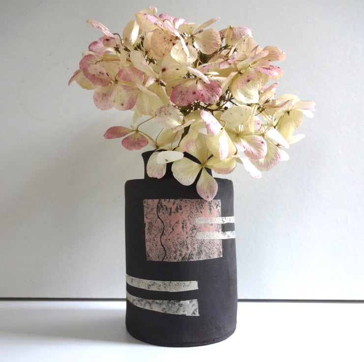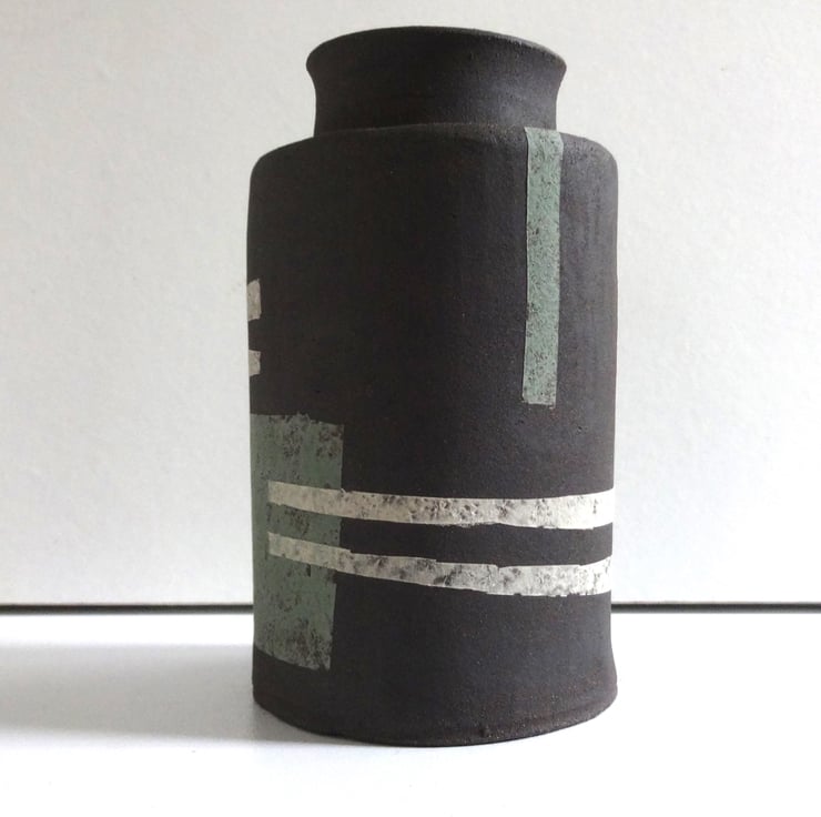 Handmade in black stoneware ceramic, I created a vase in the form of a jar to show off a posy of flowers or just to place in your home as an eyecatching piece of ceramic art. The hand-sponged design is my own creation inspired by the abstract art of the Bauhaus movement. It features two rectangular areas of colour, one pink, one green, with a sgraffito undulating line incised through the colour to expose the black clay beneath. I added stripes in grey around the body of the jar to link the two colour panels. I glazed the inside of the jar to hold water if you want to use it as a vase, while the outside is the natural matte finish of the clay itself. 13cm high to the rim of the jar and 8cm across the widest part of the base. Underneath is my potter’s mark of a swallow in flight pressed into the clay before final firing to 1185 degrees C. Hot stuff!