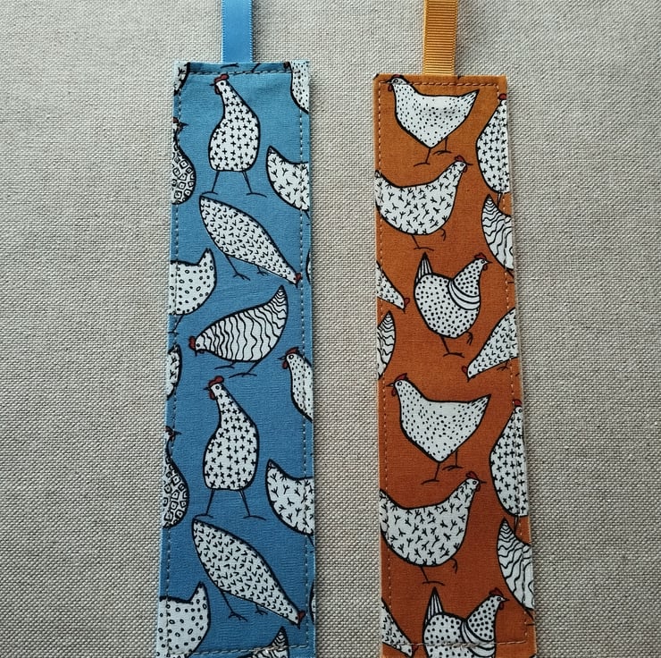Ideal for chicken lovers, a set of 2 bookmarks with coordinating ribbon and felt backing . They measure approx 19cm plus the ribbon. These are machine stitched round the edges and will fray slightly to the stitching. This gives them a rustic charm.