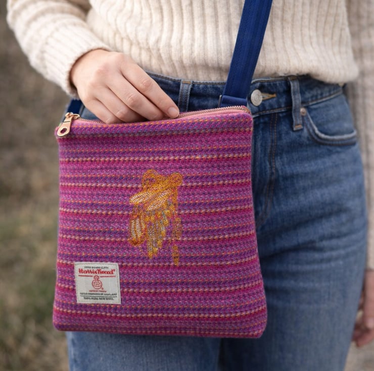 A Harris Tweed Crossbody or Shoulder bag with N American Feathers embroidery