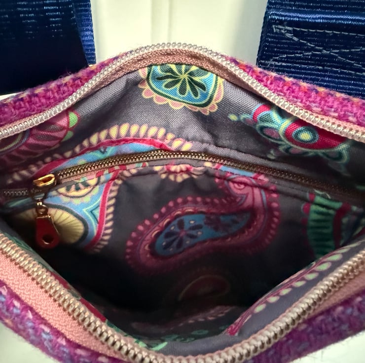 The closure is via a top zipper and the fully lined inside has a further zipper compartment. A take anywhere anytime type of bag. The lining on this bag is pretty but waterproof and has been padded.