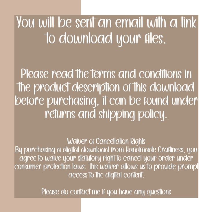 Refund Policy for Digital Downloads Acceptance of Terms By completing your purchase, you acknowledge and accept this refund policy. At Handmade Craftiness, we are committed to providing high-quality digital products. Please read our refund policy carefully before making a purchase: Waiver of Cancellation Rights By purchasing a digital download from Handmade Craftiness, you agree to waive your statutory right to cancel your order under consumer protection laws. This waiver allows us to provide prompt access to the digital content. No Refunds After Download For digital downloads, consumers are required to waive their cancellation rights before the digital content can be provided. This means that once a customer (i.e., the consumer) has downloaded the content, they have given up their consumer rights to a refund. This policy aligns with consumer law for digital goods, ensuring the protection of intellectual property and preventing unauthorized distribution. Cancelling a Digital Download Under the Consumer Contracts Regulations 2013, digital downloads are neither goods nor services, meaning the law is a little different. If you want to download something within 14 days of buying it (known as the 'cooling-off’ period), you must give your consent to waive the 14-day cooling-off period. If you do not give your consent, the 14-day cooling-off period still applies. However, you will not be able to download your digital content until this period has ended. This policy exists to prevent customers from changing their minds after downloading the content. As you are being sent a link via email to download after purchase this will count as downloading the content as you will have access to download the files from the email. Eligibility for Refunds Refunds may only be issued under exceptional circumstances, such as: The digital content is proven to be defective or incomplete. An error on our part (e.g., duplicate billing). Contact Us If you believe you are eligible for a refund due to one of the exceptional circumstances above, please contact us at orders@handmadecraftiness.co.uk with your order details, a description of the issue, and proof of purchase. Our team will review your request and respond within 7 business days. For further inquiries, please contact us at orders@handmadecraftiness.co.uk. ------------------------------------------------------------------------------------------------------------------------------------------------------------- Ownership and Usage: All artwork within this shop is the exclusive property of Handmadecraftiness. You are expressly prohibited from reproducing, altering, redistributing, reselling, or claiming ownership of any digital item from this store. However, you are permitted to incorporate products from this store into your own physical handmade items for sale as a hobbyist. TERMS OF USE 1. You may print and use these items in a tangible journal/scrapbook/craft project etc. 2. You MAY NOT sell or share these files. 3. You MAY NOT reproduce/altar/redistribute our designs as a digital or physical item. 4. You MAY NOT sell or manipulate these files for resale purposes. 5. You MAY NOT share these files individually or as kits.