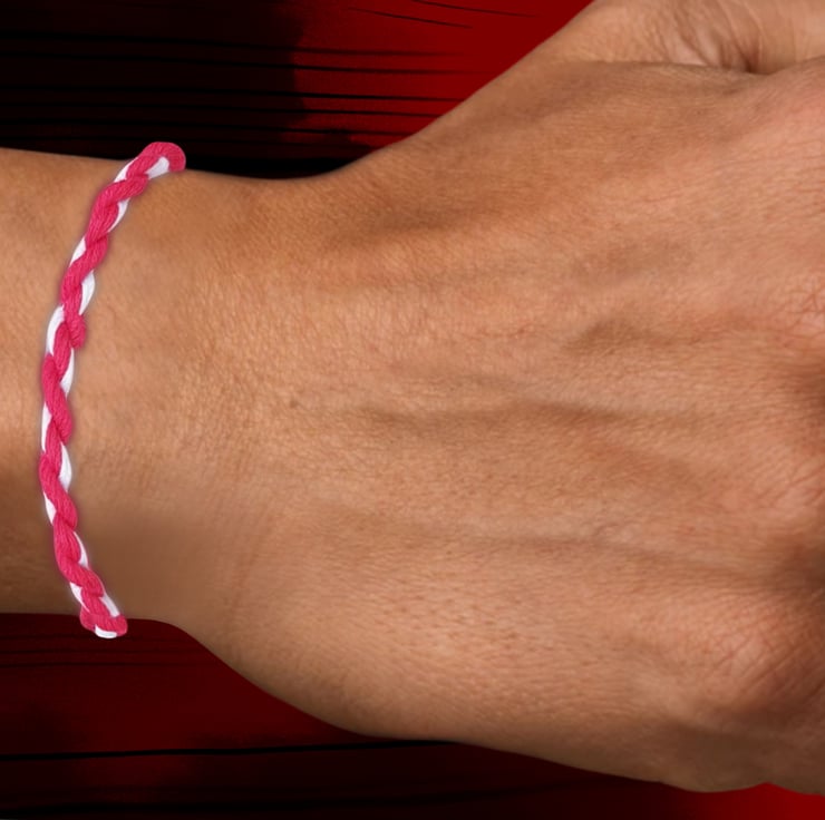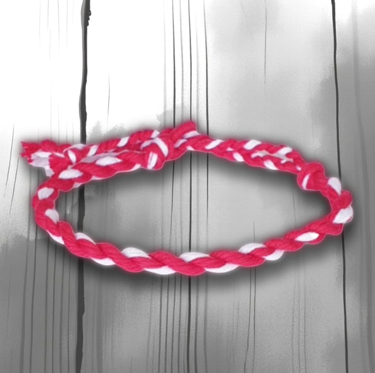 Red and white coloured handmade twisted team colours bracelet. Made with quality embroidery thread. Can be kept clean washing by hand with a little washing powder, rinse thoroughly and leave to dry.