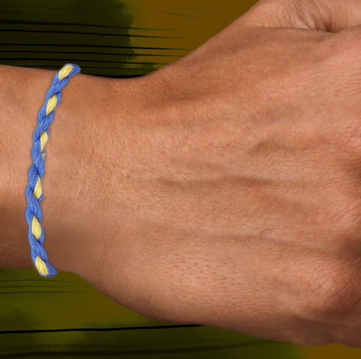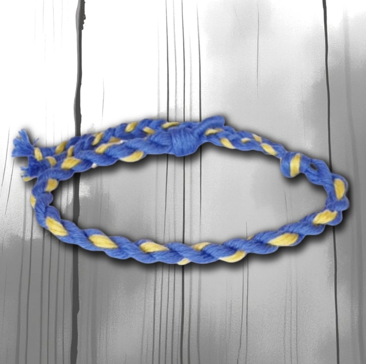 Blue and yellow coloured handmade twisted team colours bracelet. Made with quality embroidery thread. Can be kept clean washing by hand with a little washing powder, rinse thoroughly and left to dry.