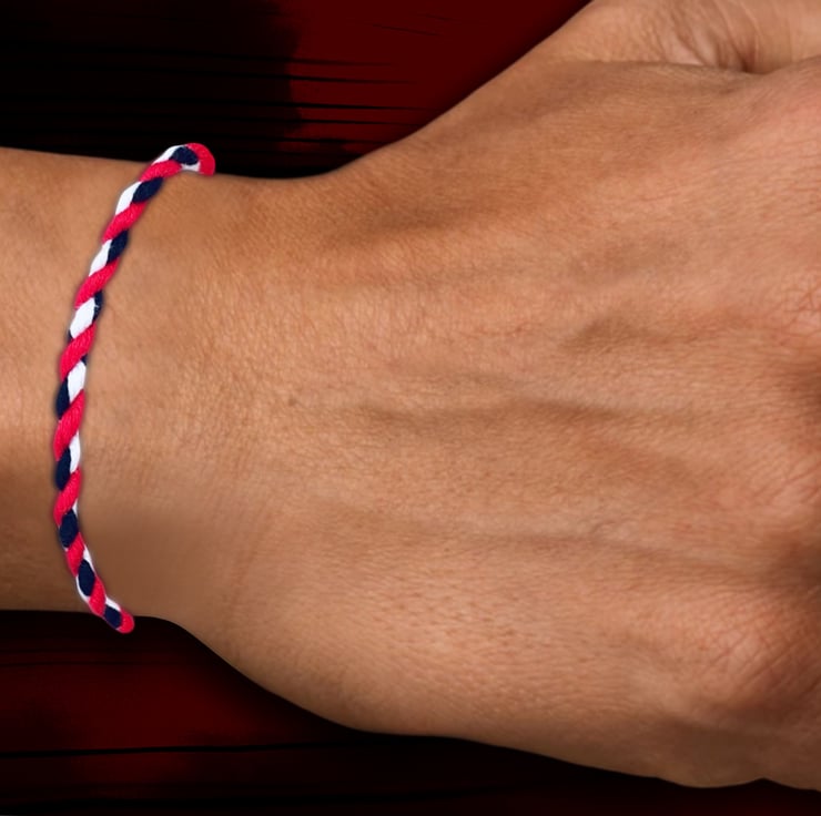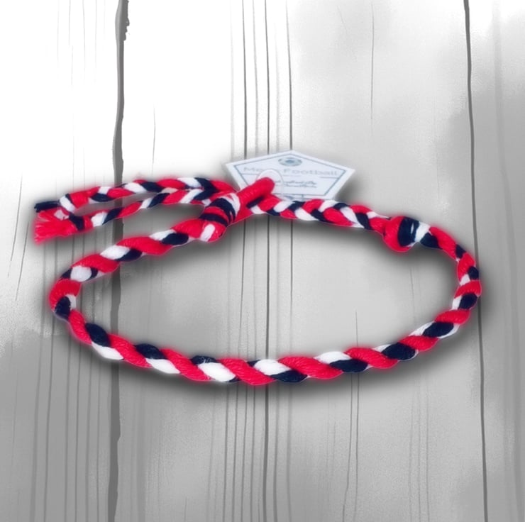 Red, black, white coloured handmade twisted team colours bracelet. Made with quality embroidery thread. Can be kept clean washing by hand in a little washing powder, rinse thoroughly and left to dry.