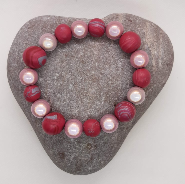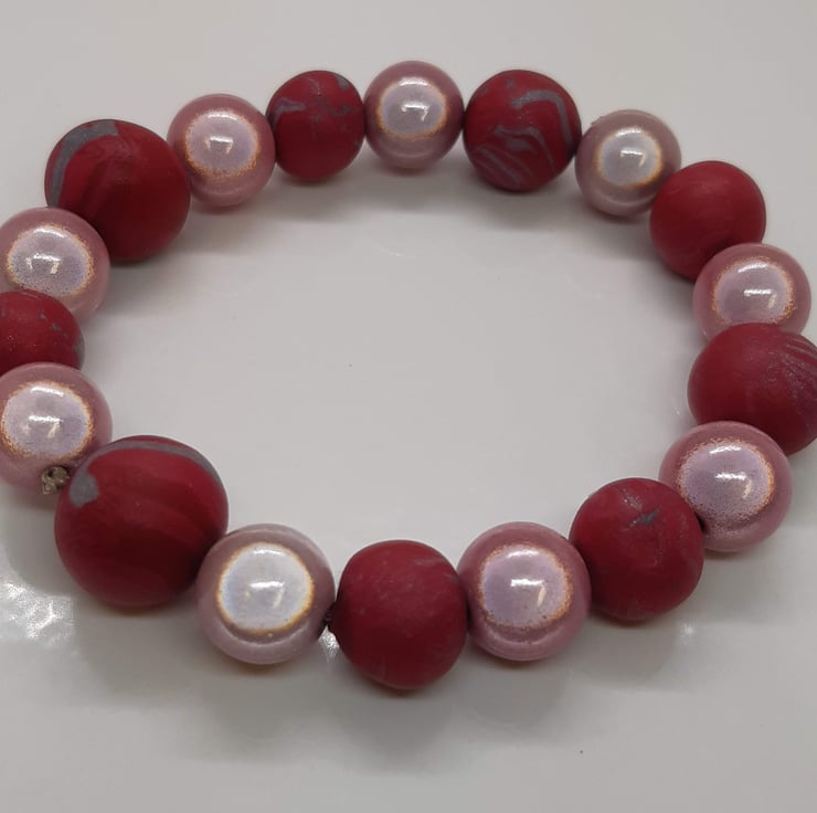 A brightly coloured bracelet featuring handmade polymer clay beads in a magenta and silver swirl design