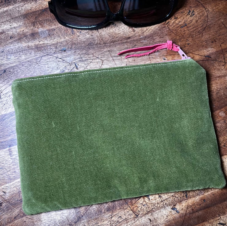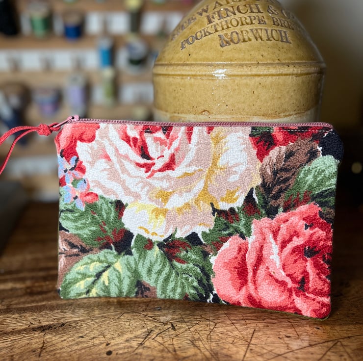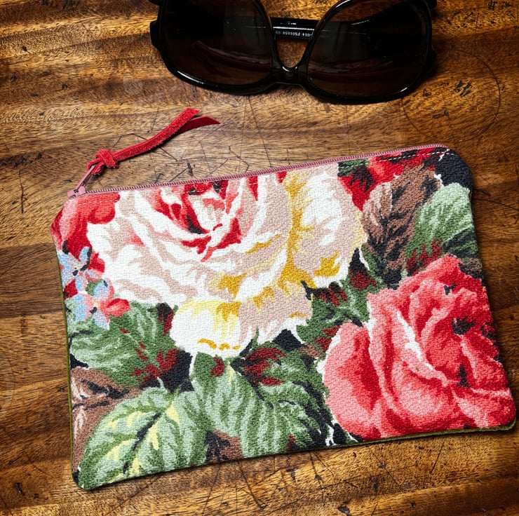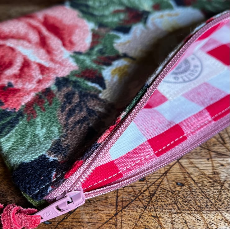 This pretty vintage barkcloth has beautiful roses on a black background. I’ve made a handy small pouch, big enough for your phone and keys, with a velvety green moleskin back and red gingham cotton lining.