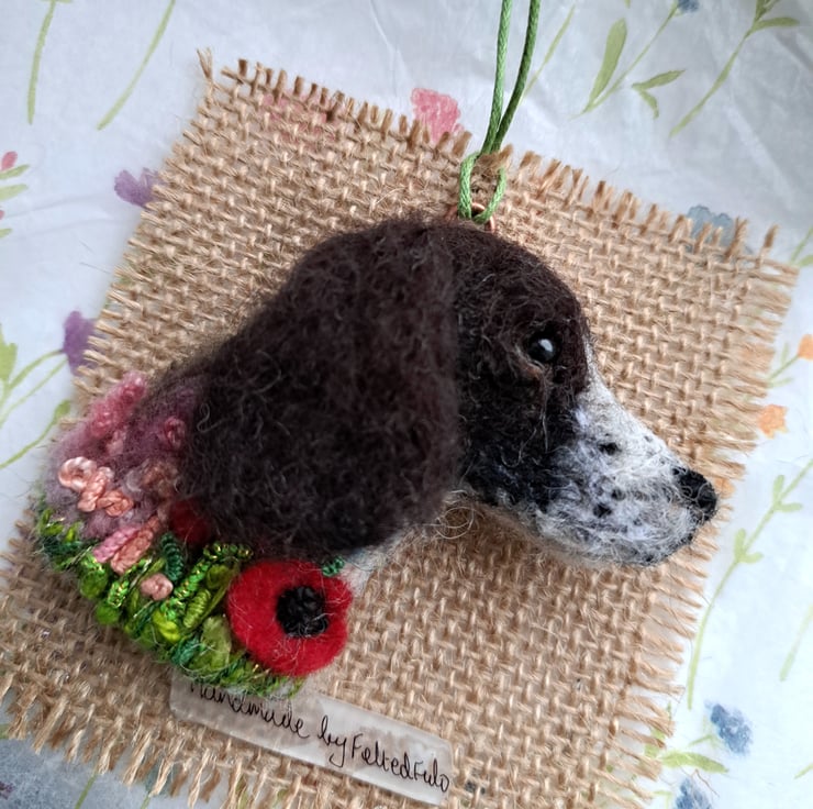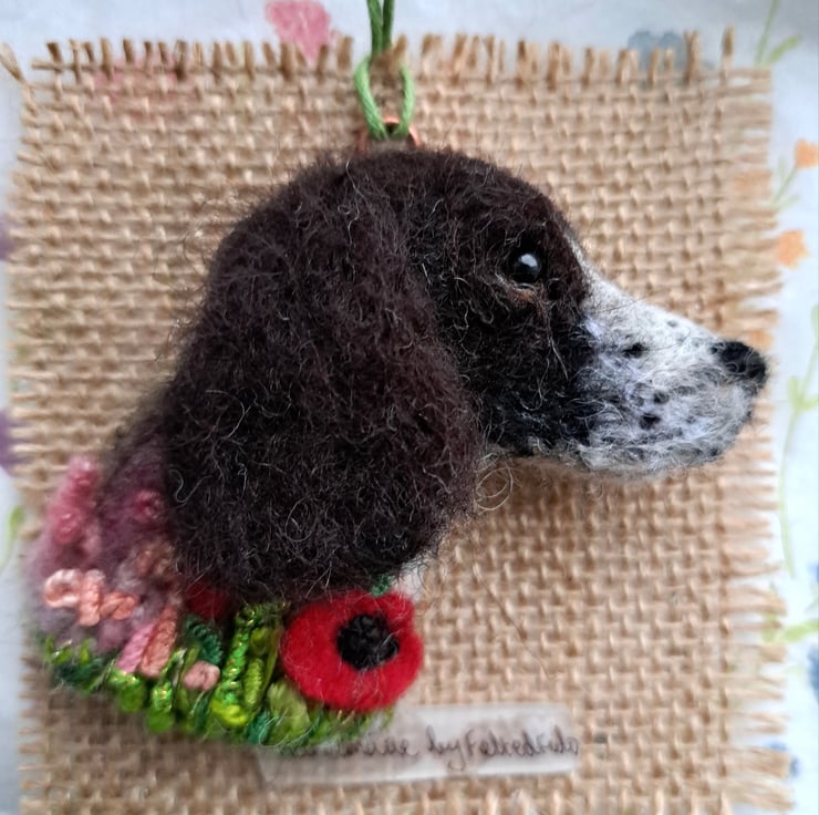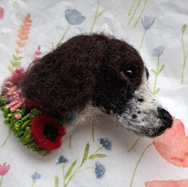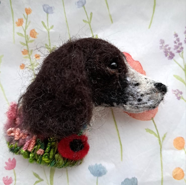 needle felted black & white springer spaniel brooch,with embroidered details,approx 3 inches,metal brooch fitting to rear.