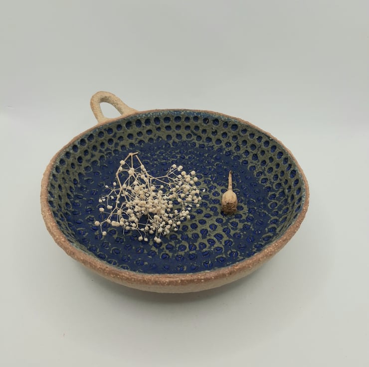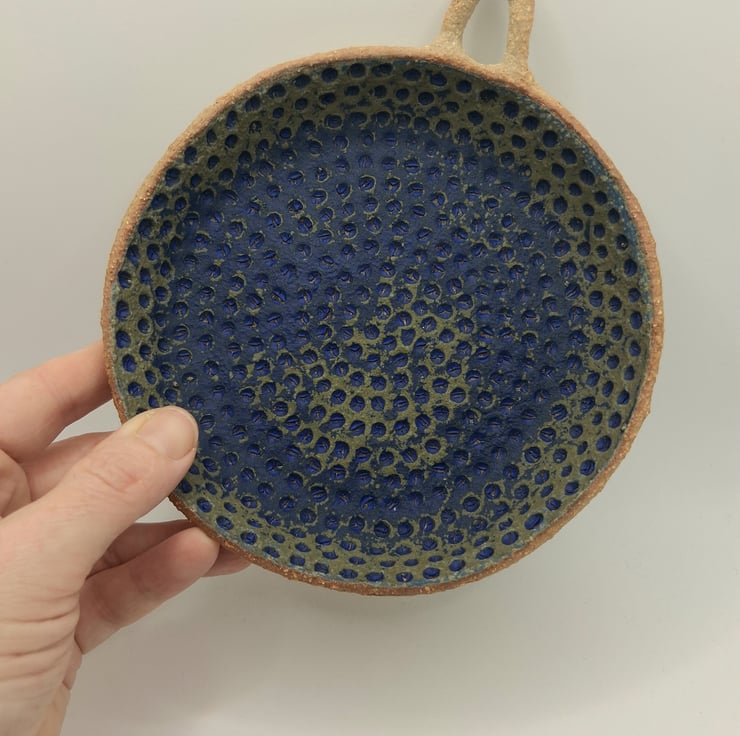 Fired to stoneware temperature (1280C) with a matt dark blue/green glaze.