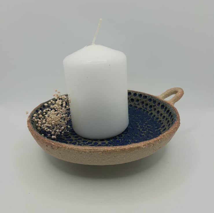 Beautiful tripod candle holder hand built from textured, buff coloured clay. Dimpled for added textural interest with delicate round handle.