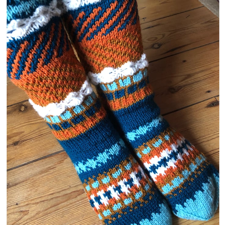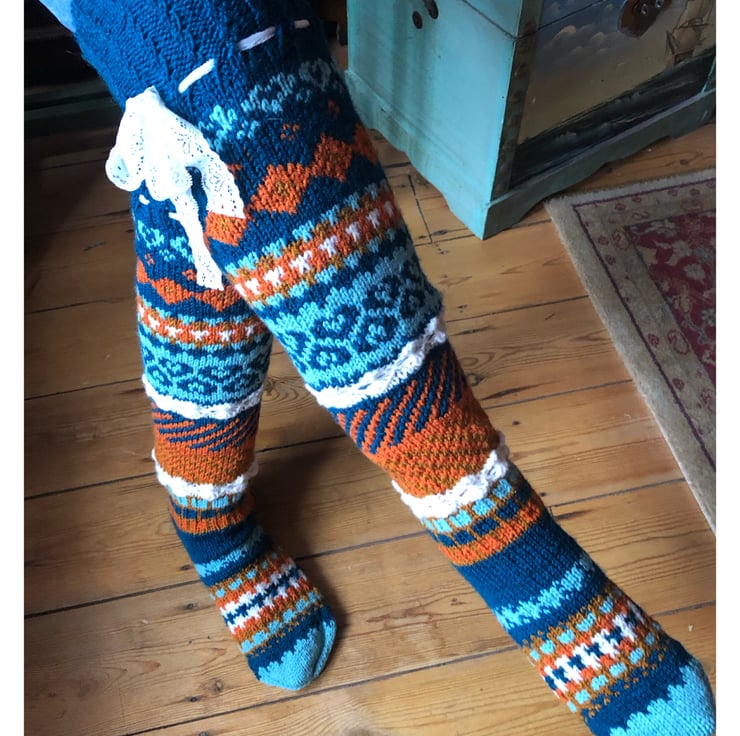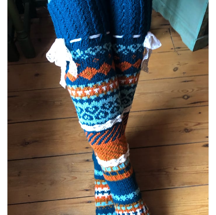Knitted with DK acrylic Yarn base colour teal with assorted complimentary colours.