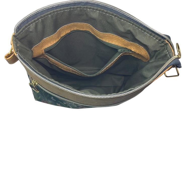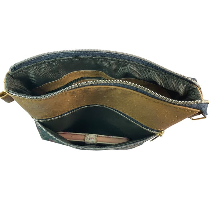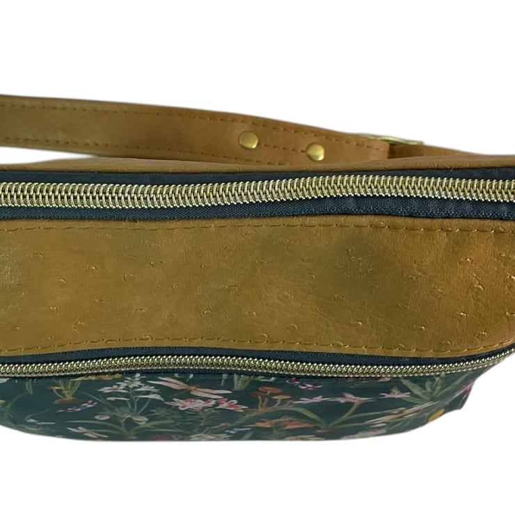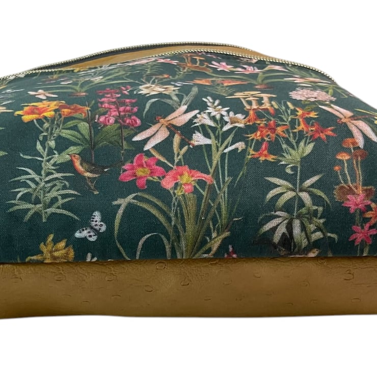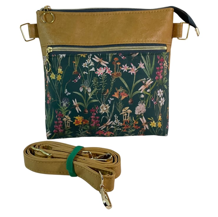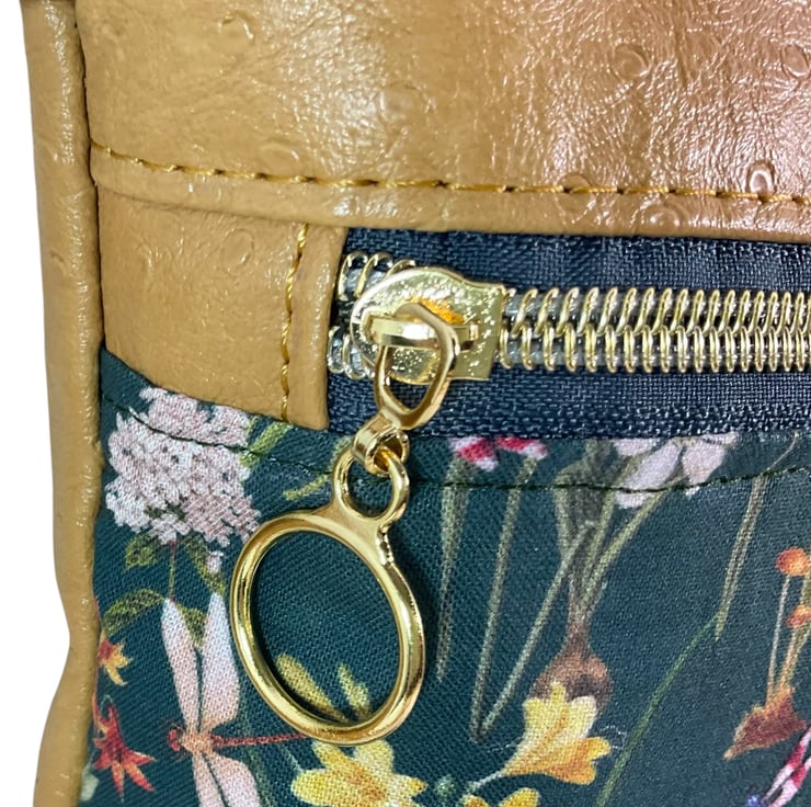 This handy sized bag is made of a caramel shade of vinyl/ vegan leather with an ostrich effect. It has been paired with a front pocket made in designer ‘spoonflower’ cotton fabric that features a variety of flower sprays and toadstools and the odd Robin and some tiny dragon flies and butterflies to discover!