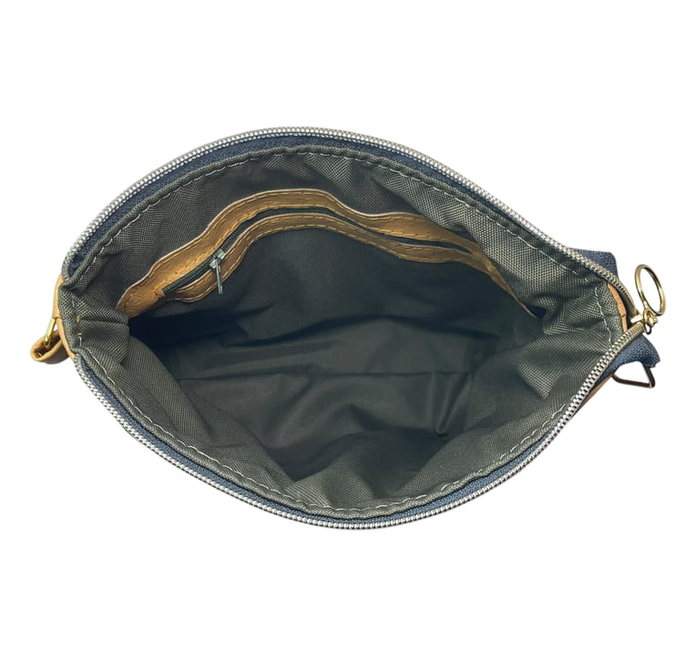 The bag is lined in sage green water resistant canvas and has a zip pocket with a matching vinyl surround internally.
