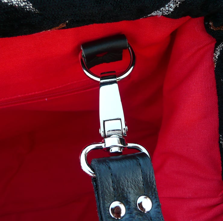 This large overnight bag is made from heavy upholstery grade chenille fabric, it features a semi solid bag base, an internal spring loaded bag frame, handcrafted black leather carry handles and detachable shoulder strap. Inside the bag is fully lined in red cotton canvas and features a key clip, 2 slip pockets, a large zipper pocket and 2x D rings for the detachable shoulder strap.