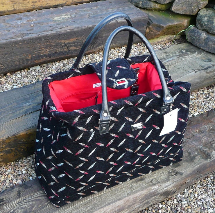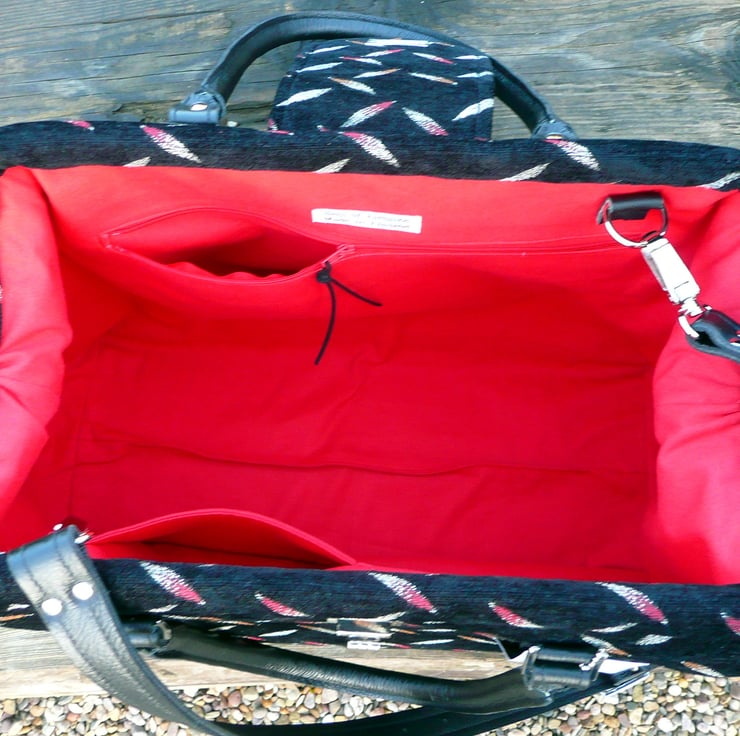 This large overnight bag is made from heavy upholstery grade chenille fabric, it features a semi solid bag base, an internal spring loaded bag frame, handcrafted black leather carry handles and detachable shoulder strap. Inside the bag is fully lined in red cotton canvas and features a key clip, 2 slip pockets, a large zipper pocket and 2x D rings for the detachable shoulder strap.