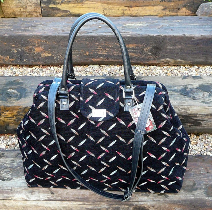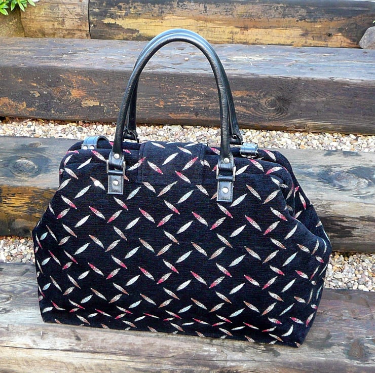 Black chenille Mary Poppins style carpet bag weekend travel bag