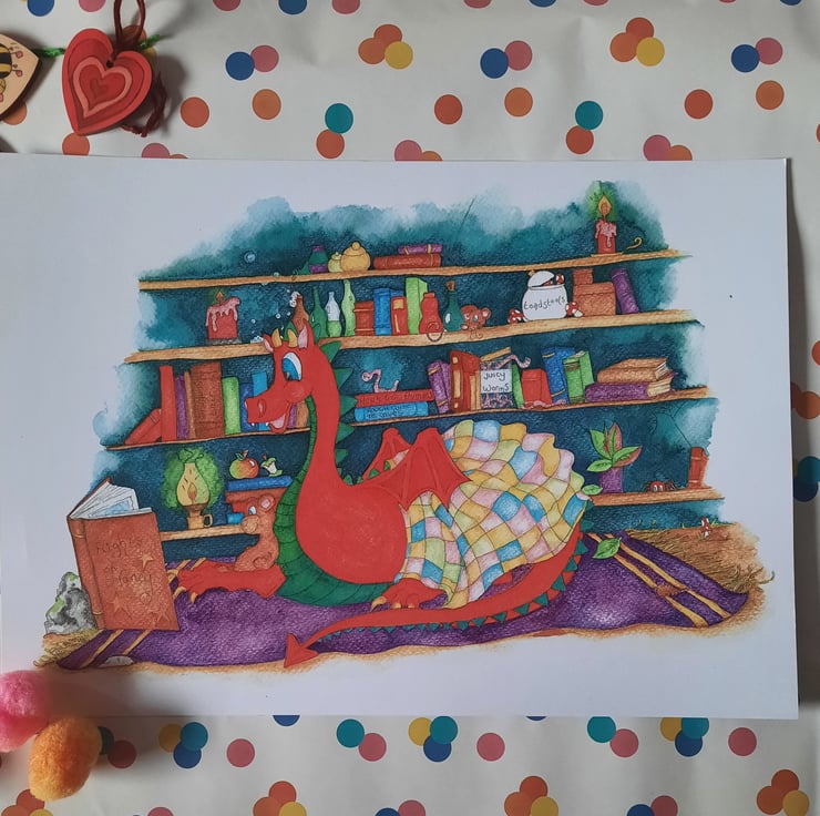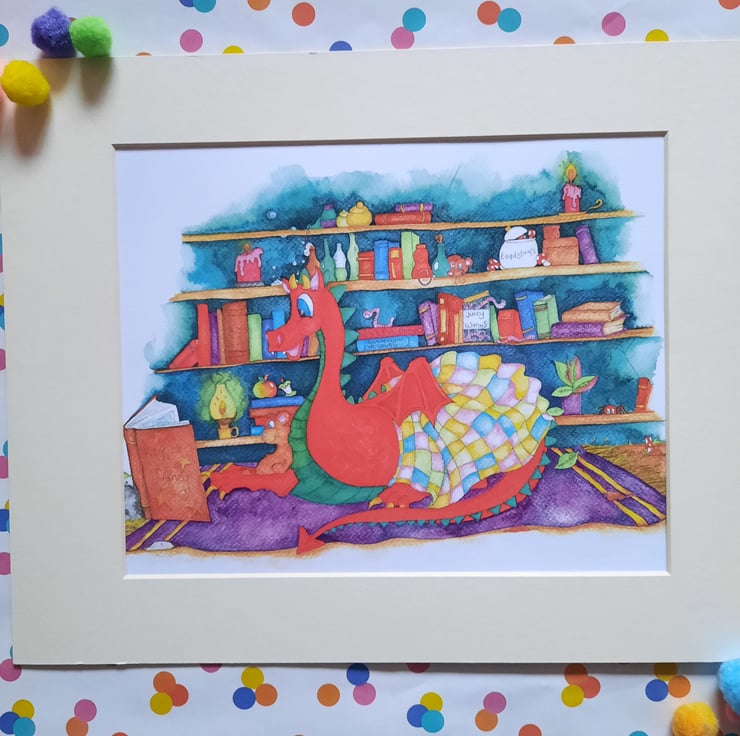 This is a print of an original illustration, evoking a cosy feel, with the dragon looking so comfortable in his surroundings – with all his personal belongings around him. The more you look at this one, the more things you might find hiding out on those shelves.