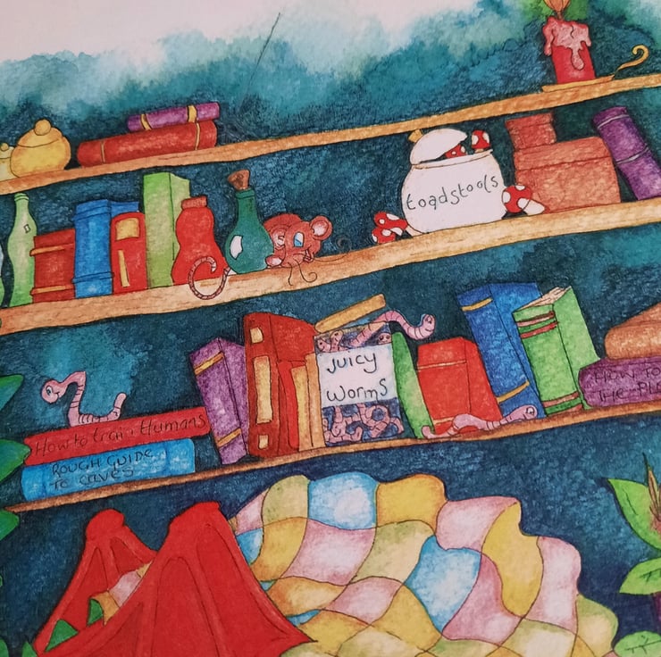 This actually started as a personal project - a sketch that developed over time into the final piece you see now. As I drew - lots of little things sneaked onto the shelves, so there is lots to see if you look carefully.