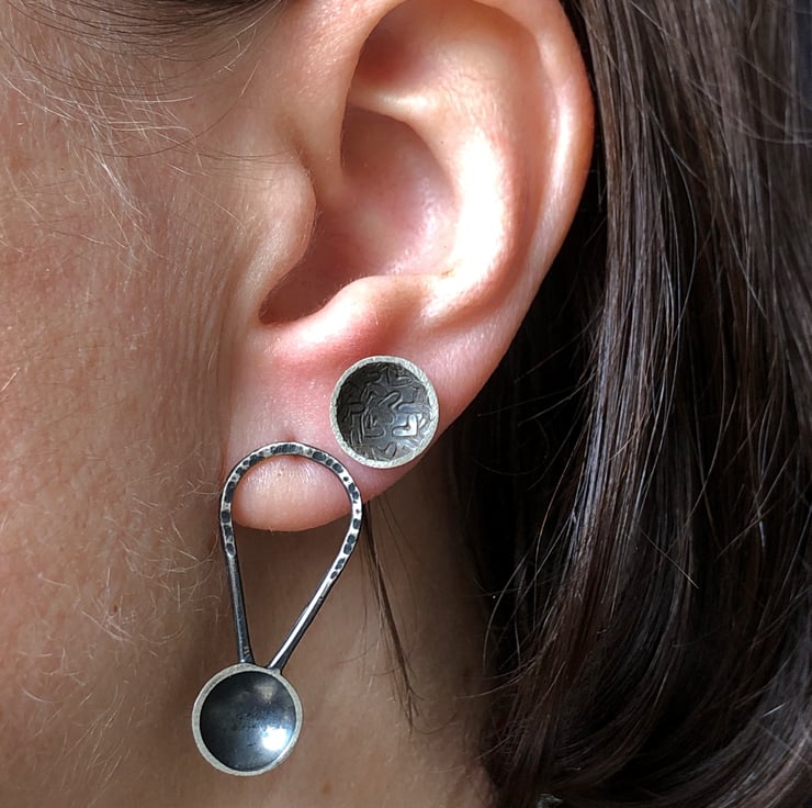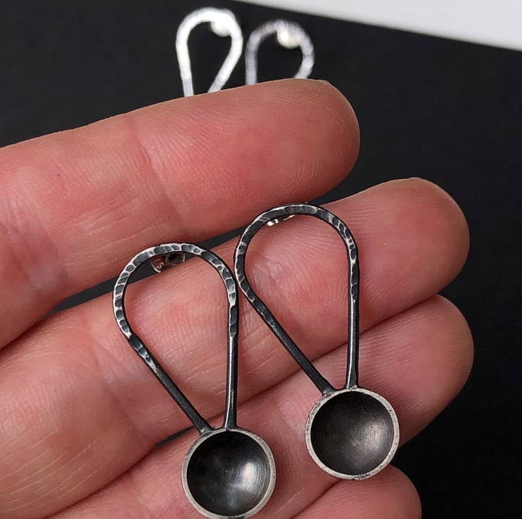 Oxidised silver abstract spoon stud earrings with hammered detail. Statement stud earrings that are lightweight and comfortable to wear.