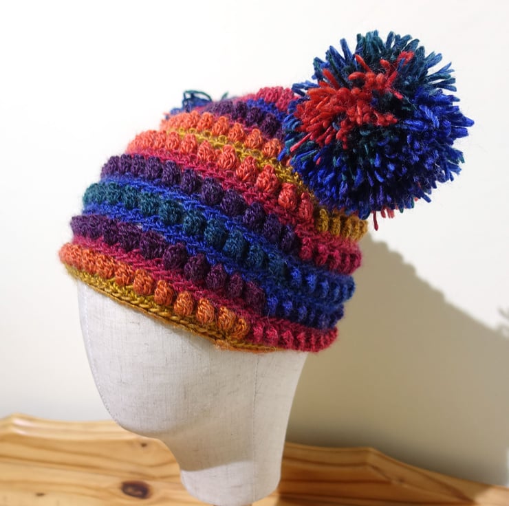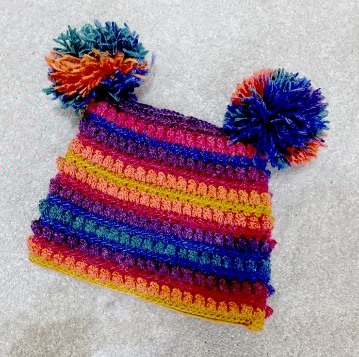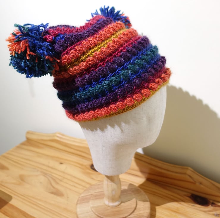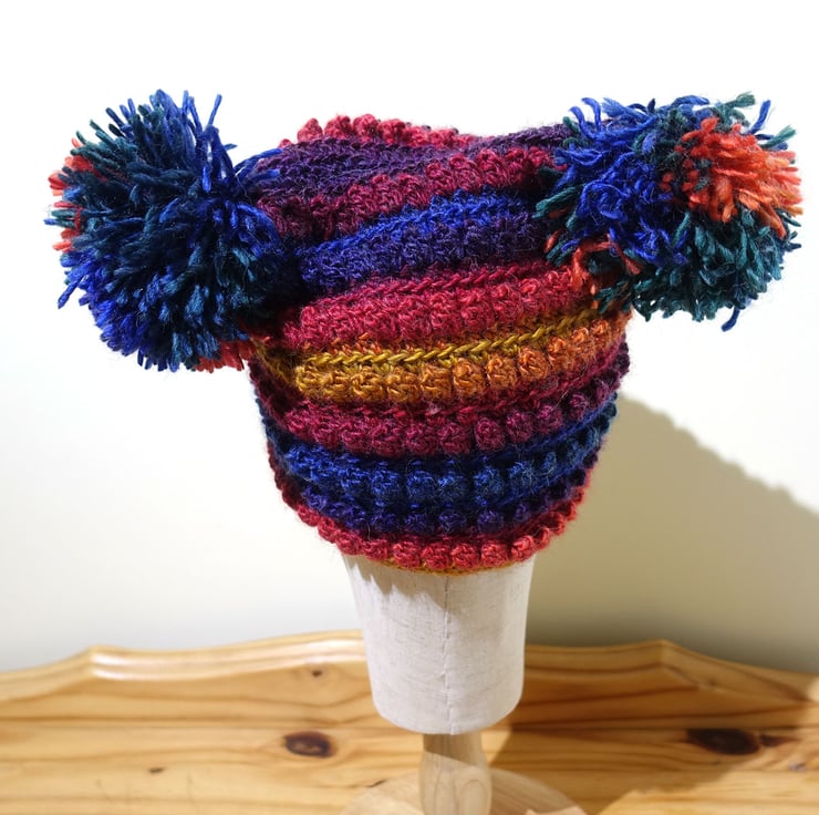 Double pom pom hat made from soft acrylic yarn in earthy rainbow shades. This hat is medium sized so fits most head sizes. It is stretchy and soft and can be folded back at the front.