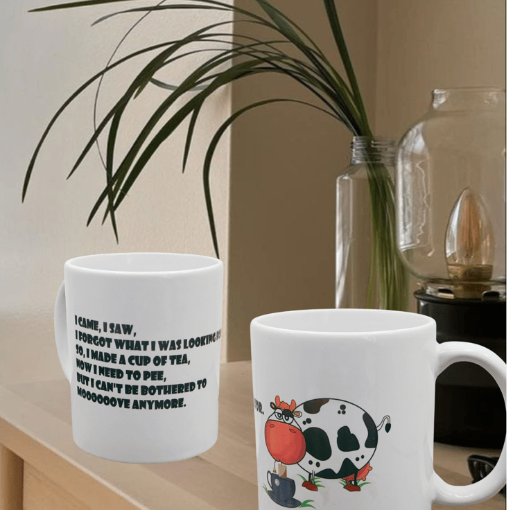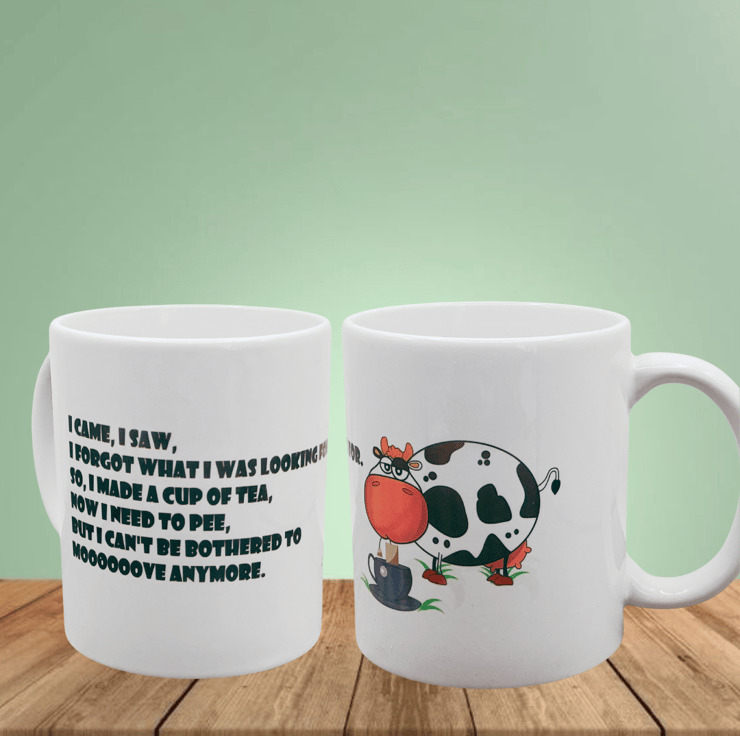 Featuring the witty words "I came, I saw, I forgot what I was looking for. So, I made a cup of tea, now I need to pee but cannot be bothered to mooooove anymore".