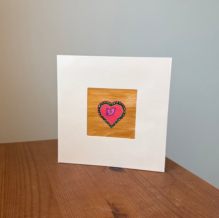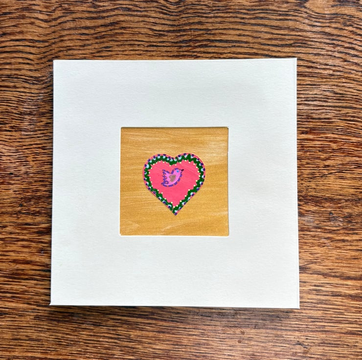 Made by hand piecing a hand painted paper heart motif onto a gold background this card for someone you love will suit many occasions. The heart motif has been hand painted by me with a small bird and set against a gold painted background.