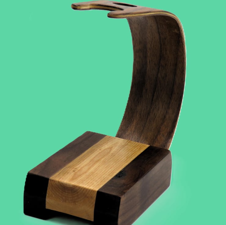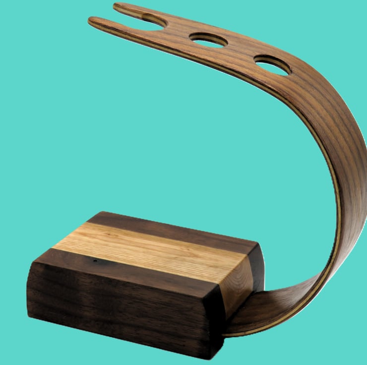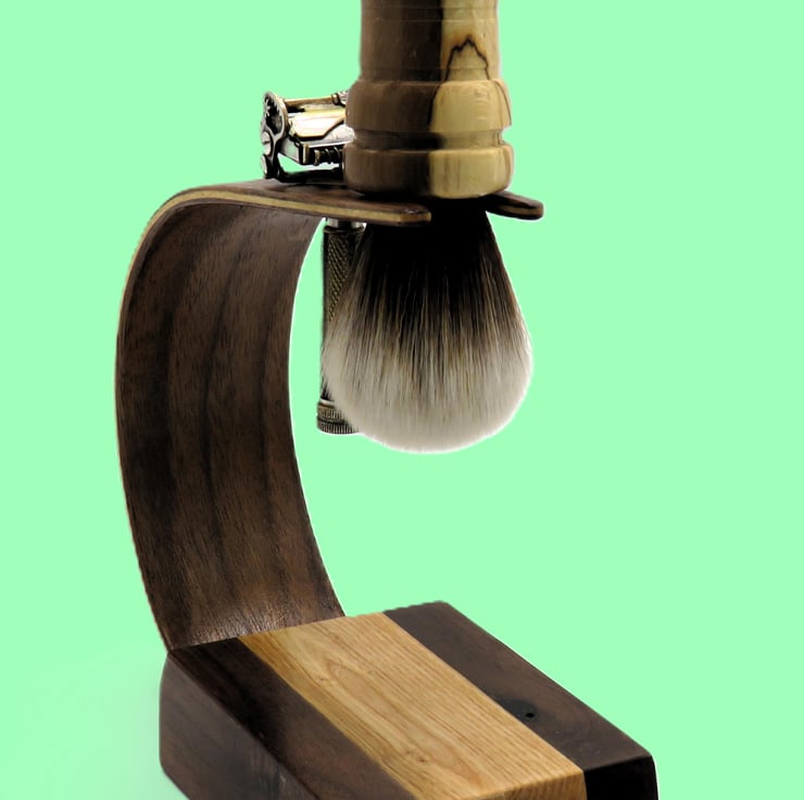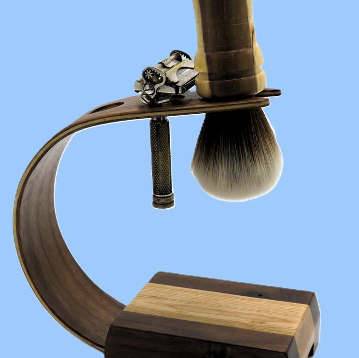 This shaving brush and razor stand, will take two razors and a shaving brush, the curvature of the laminated black walnut and maple forms an area for the shaving brush and razors to be stored. This is a predominately dark coloured wood stand due to the walnut used.