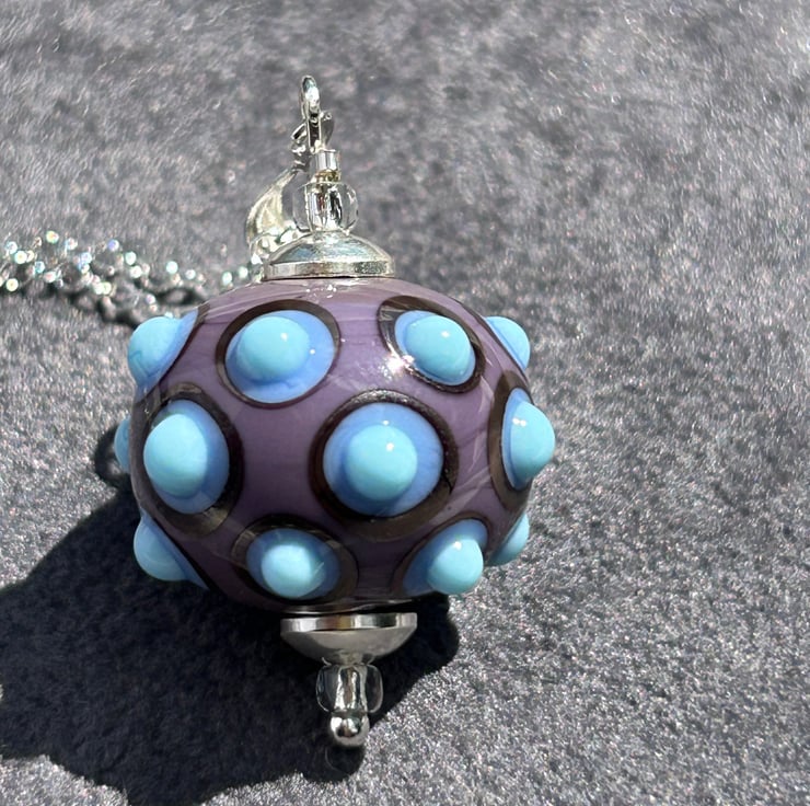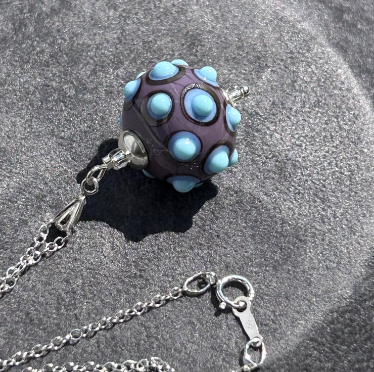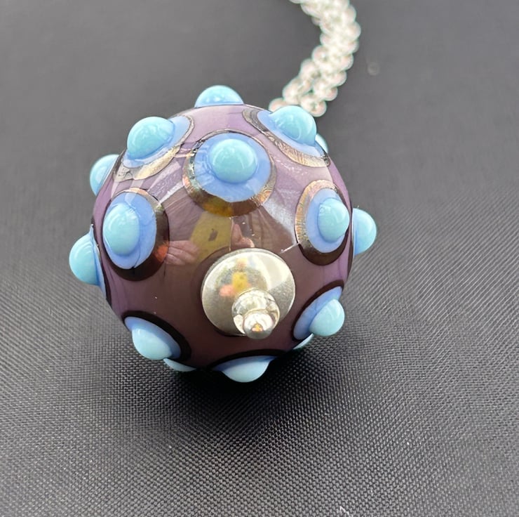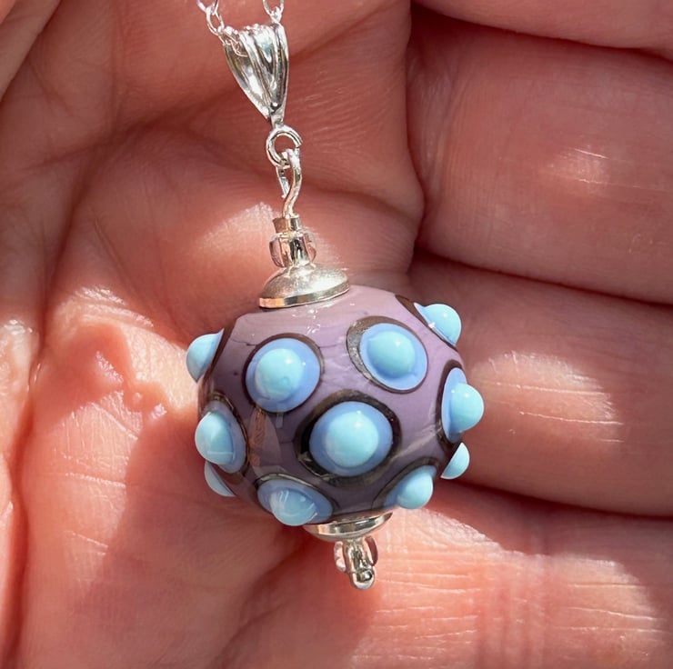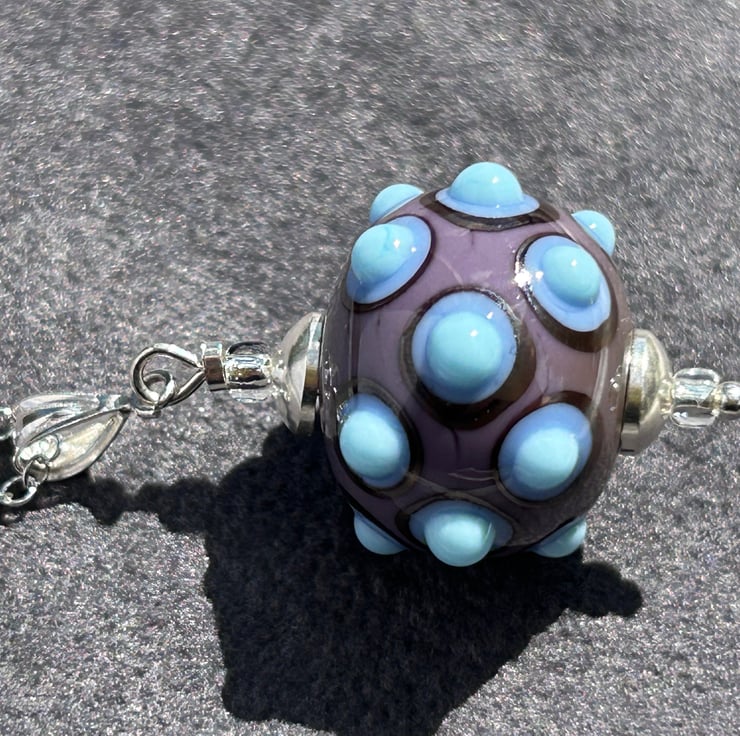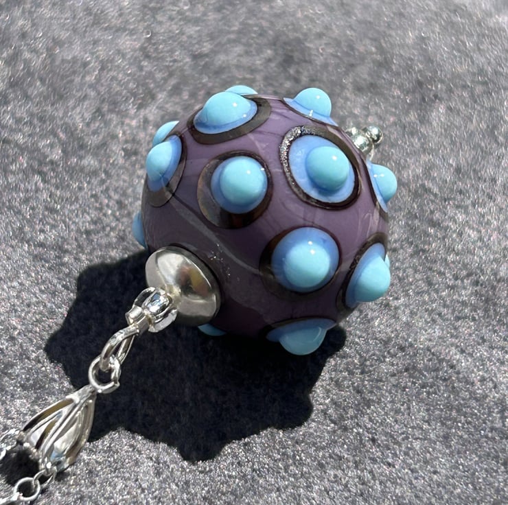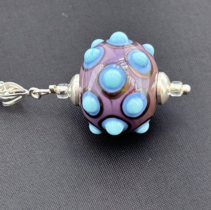 My lampwork glass bead that I created in my studio has a base of a glass called 'new violet' with melted in spots of 'light silver plum' glass that have both got a silvery sheen on them after being passed through the flame, then there is a layer of 'periwinkle' blue spots and finally bumps of sky blue to finish the bead design.
