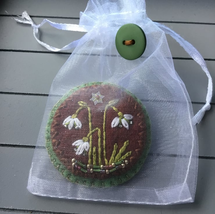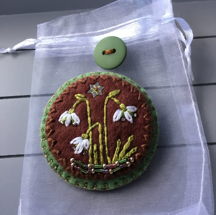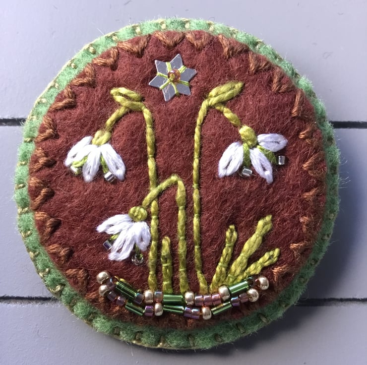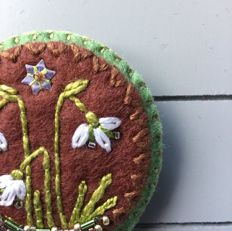 This Hand Embroidered Snowdrop Brooch has three hand embroidered Snowdrop flowers standing in a garden or a wood. They are embroidered on circles of pale green and coffee brown (the Pantone colour for 2025) wool felt. These lovely delicate Snowdrop flowers appear in the Spring time and the colours of white and green embroidery threads, reflect this distinctive flower… with crystal seed beads for their stamens. These Snowdrop flowers stand in a border of green, copper and golden beads ….that glint under the silver sequin star.