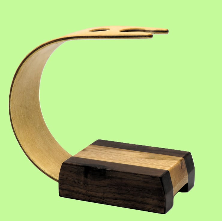 This shaving brush and razor stand, will take two razors and a shaving brush, the curvature of the laminated black walnut and maple forms an area for the shaving brush and razors to be stored. This is a predominately light coloured wood stand due to the maple and English ash used.
