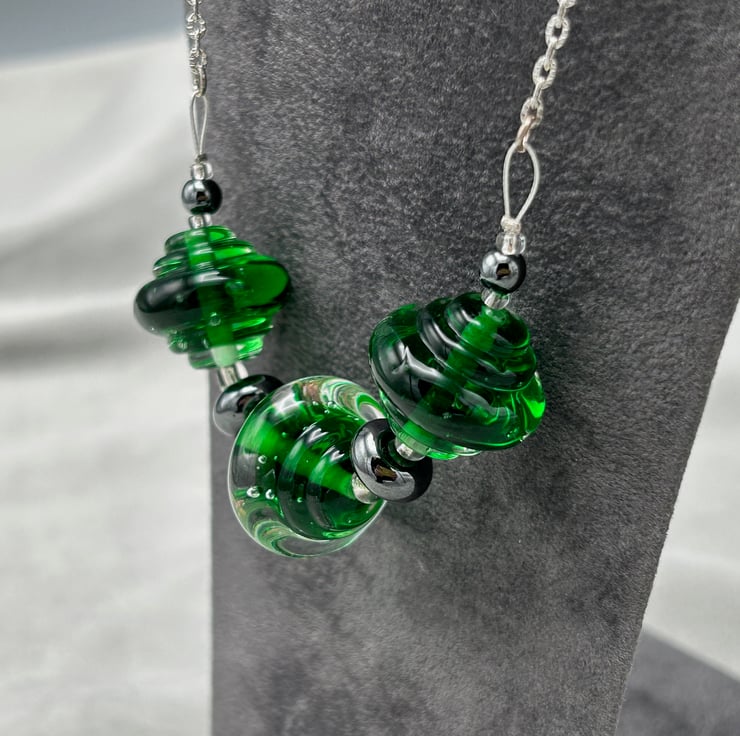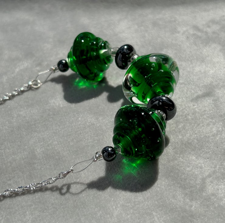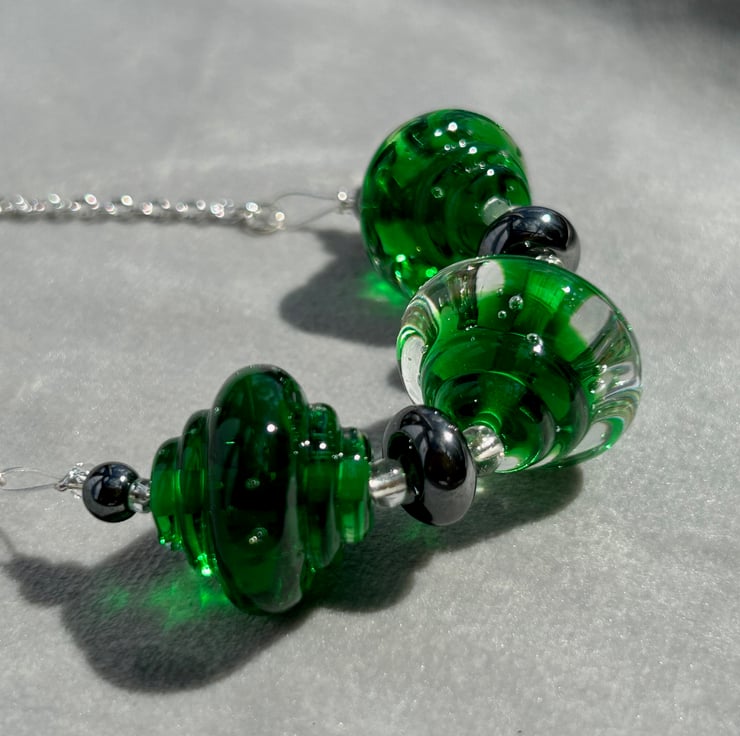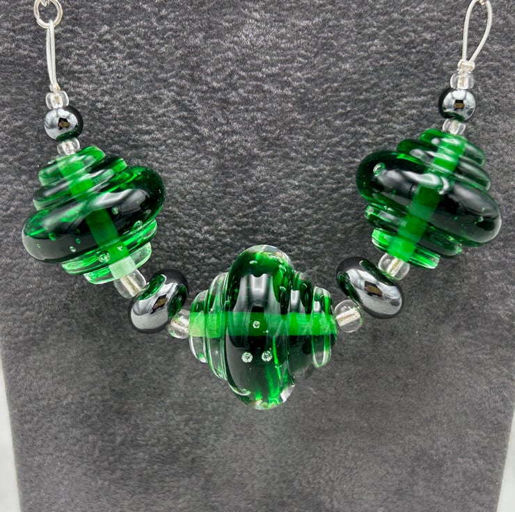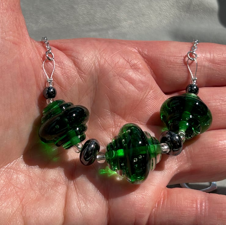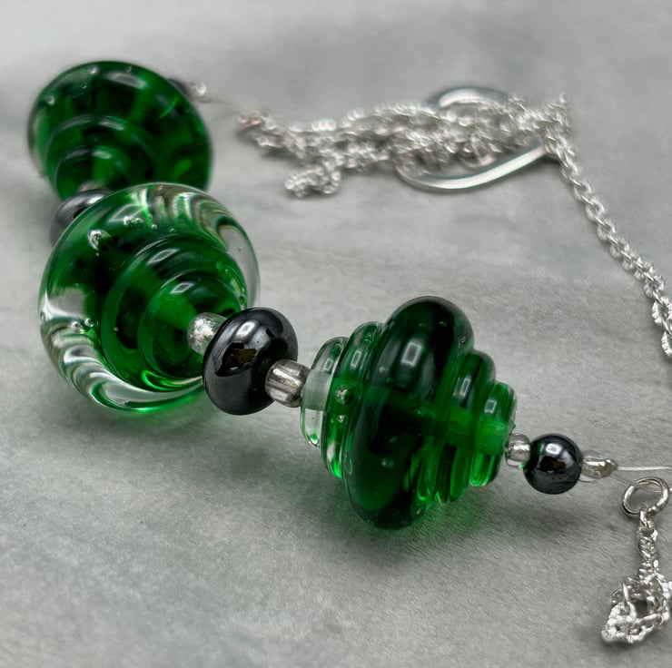 There are 3 of my handmade glass beads in this necklace design; a dark green transparent core with clear outer encasement which has been moulded into a fancy baroque shape when the glass was hot and malleable using a graphite press. The central bead is 22mm top to bottom x 20mm in diameter, the two beads either side are 20mm x 18mm.