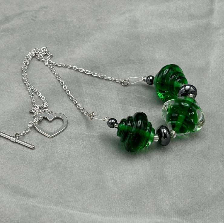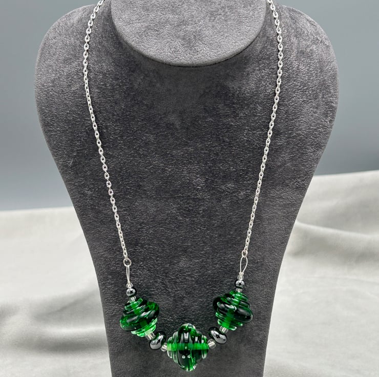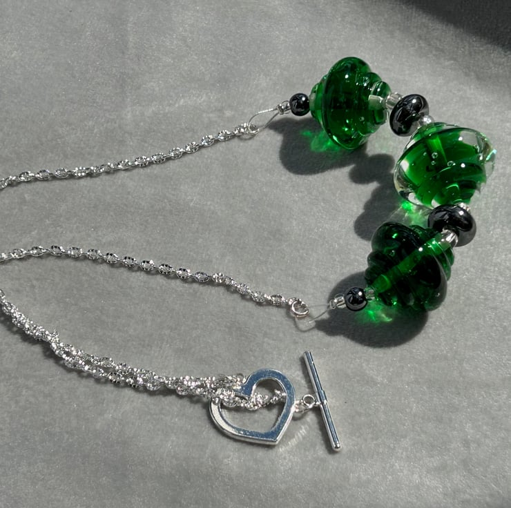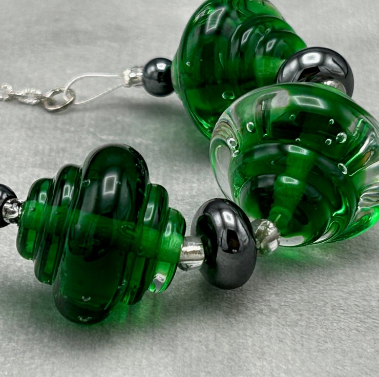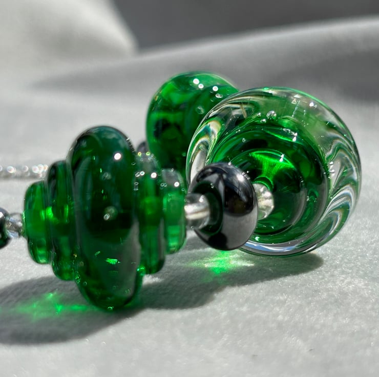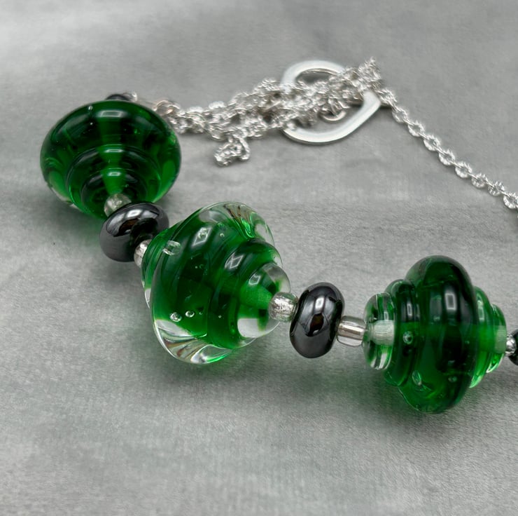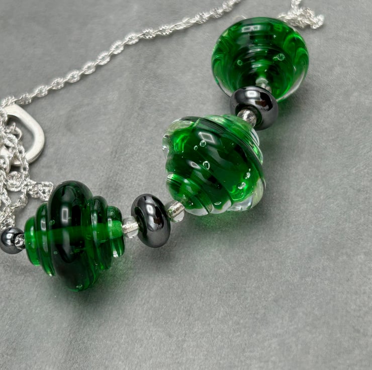 There are 3 of my handmade glass beads in this necklace design; a dark green transparent core with clear outer encasement which has been moulded into a fancy baroque shape when the glass was hot and malleable using a graphite press. The central bead is 22mm top to bottom x 20mm in diameter, the two beads either side are 20mm x 18mm.