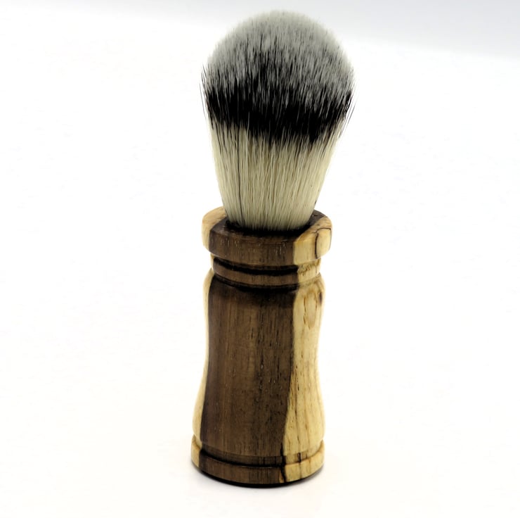 This shaving brush is turned from a piece of Spalted Beech and Black Walnut laminated wood. The finish is achieved by sanding down with grades of sandpaper to a fine grit and sealed using Cellulose Sanding Sealer followed with three coats of Melamine Lacquer and finished with 3 coats of microcrystalline wax. The knot is a premium synthetic one which is a 22mm Faux Badger Synthetic Bristle Knot, as shown.