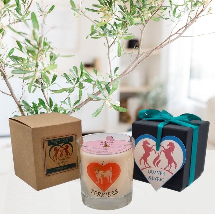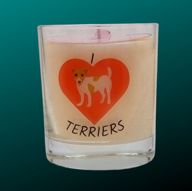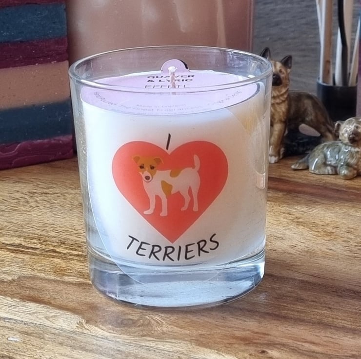 Scented candle with I Love Terriers design on the glass container. Ideal dog lovers gift. Handmade in Northamptonshire using a quality rapeseed and mineral wax blend, the finest range of fragrances, hand-poured into quality glass containers and supplied in a kraft box. The design on the scented candle is made from permanent vinyl which can be cleaned (hand wash only) allowing the glass to be re-purposed as part of your home decor after the candle has burned.