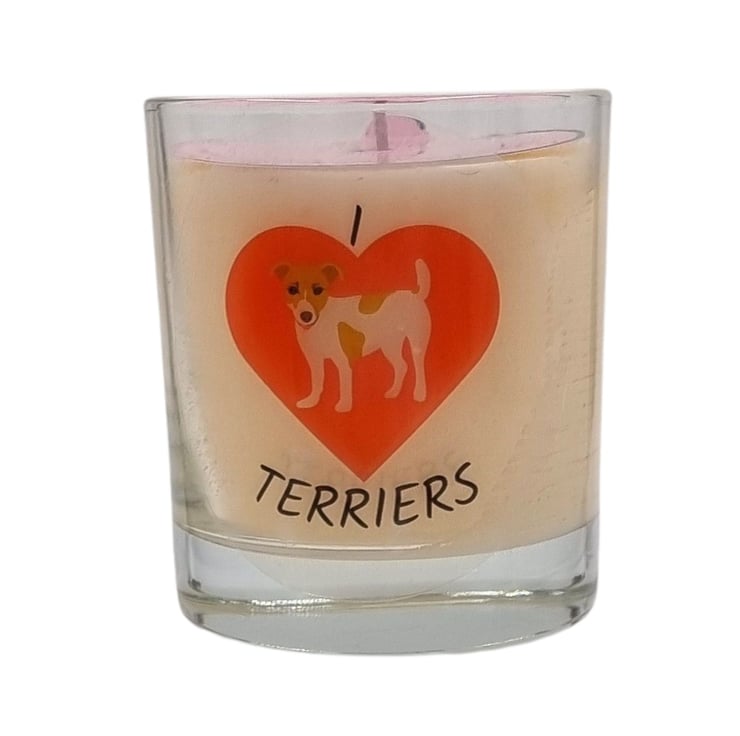 Scented candle with I Love Terriers design on the glass container. Ideal dog lovers gift. Handmade in Northamptonshire using a quality rapeseed and mineral wax blend, the finest range of fragrances, hand-poured into quality glass containers and supplied in a kraft box. The design on the scented candle is made from permanent vinyl which can be cleaned (hand wash only) allowing the glass to be re-purposed as part of your home decor after the candle has burned.