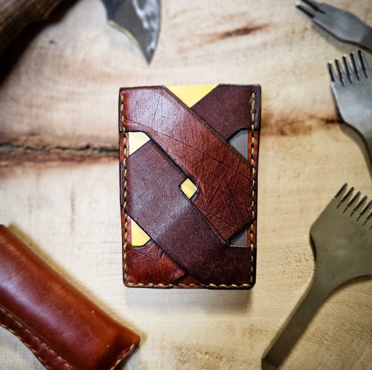 This card wallet is one of a kind, made from a mixture of badalassi carlo pueblo leather in tobacco, and badalassi ecbatana leather in cognac, and Walpier ‘Rocky’ leather, and sewn together with ritza 0.8 thread in olive. Ecbatana is a very unique leather, with each hide having different marks embossed by hand into it. I love this leather and think it has a very natural, wood grain appearance. This wallet is made with one of my last pieces of this leather and so there will be no more like it in my store. The wallet has one card slot on the front and one on the back, with room for another card or cash on the inside. This is a light weight card holder, and as such cannot take more than 3 cards in my experience. It will initially be stiff to put cards into, but like all good quality leather wallets will loosen up with time and fit your cards perfectly.
