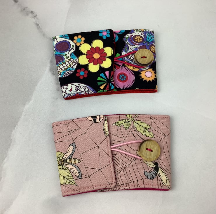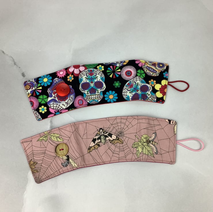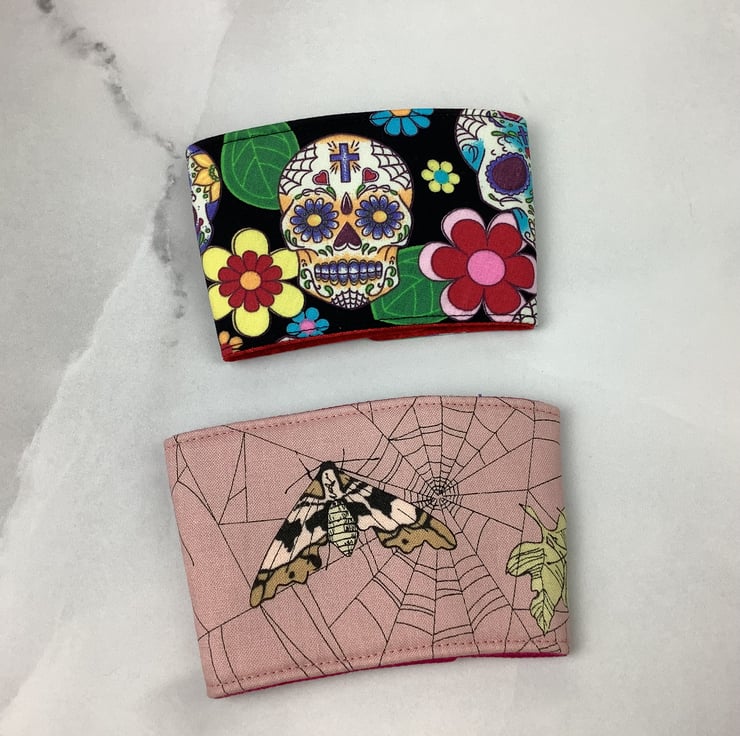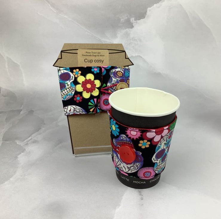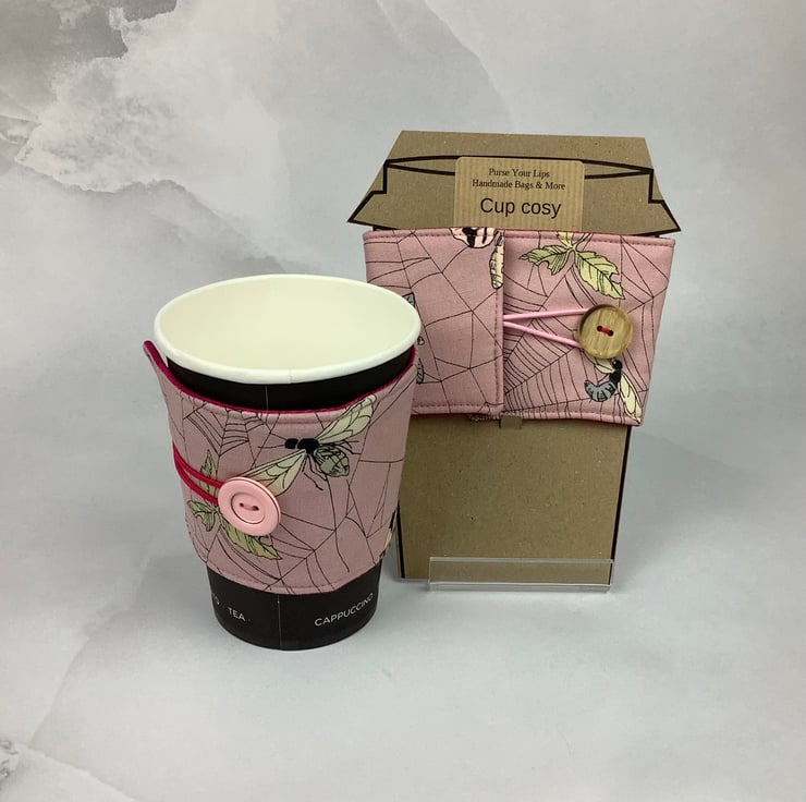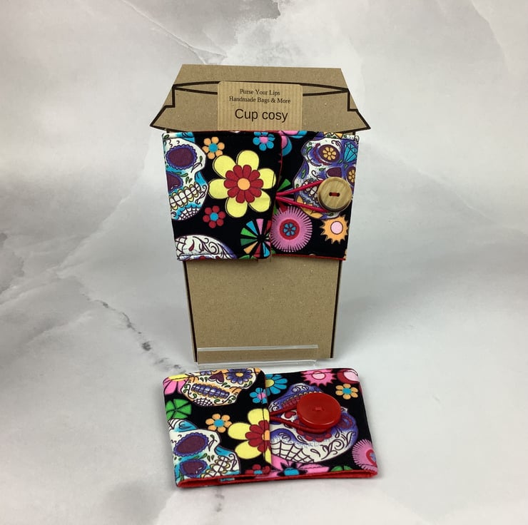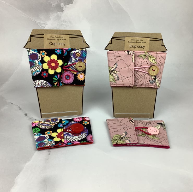 Each of my unique cup holders is individually made by me in my relaxing and tranquil little West Sussex garden studio so the pattern placement and button may vary.