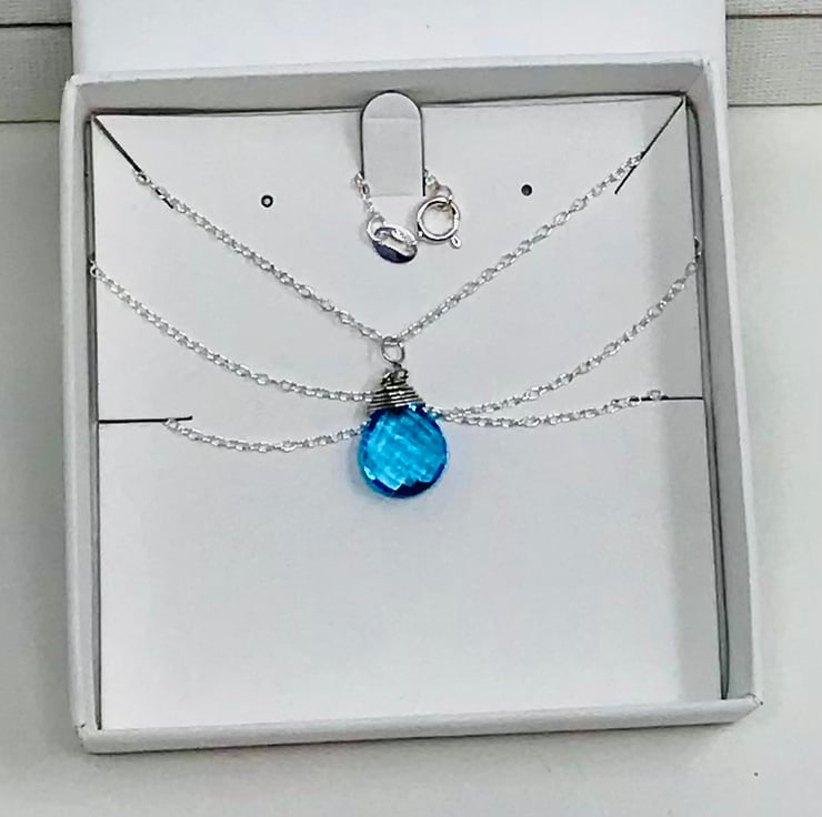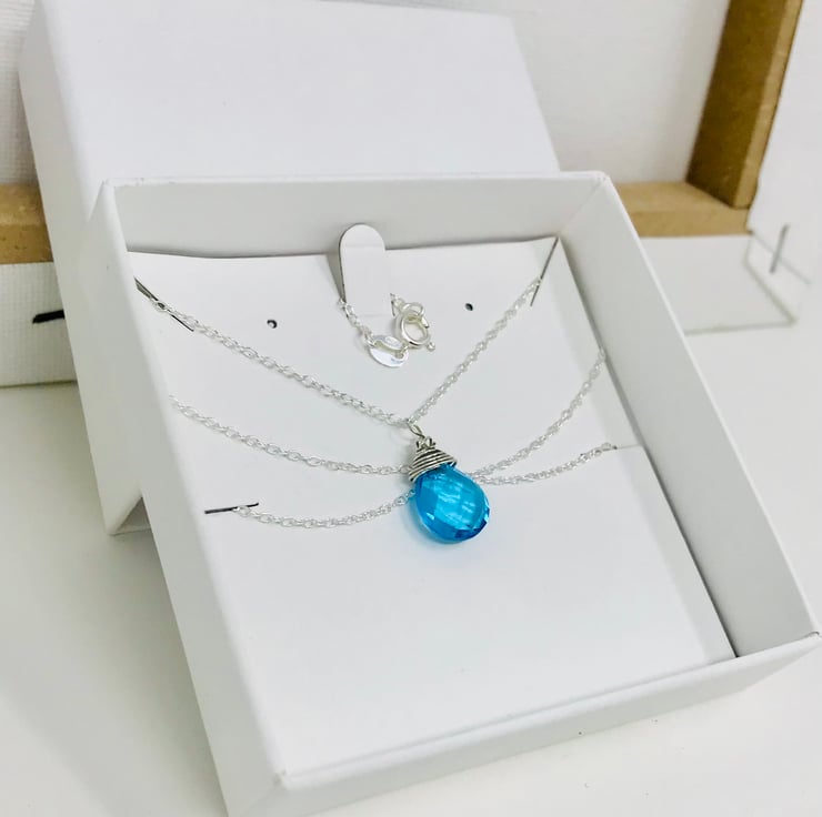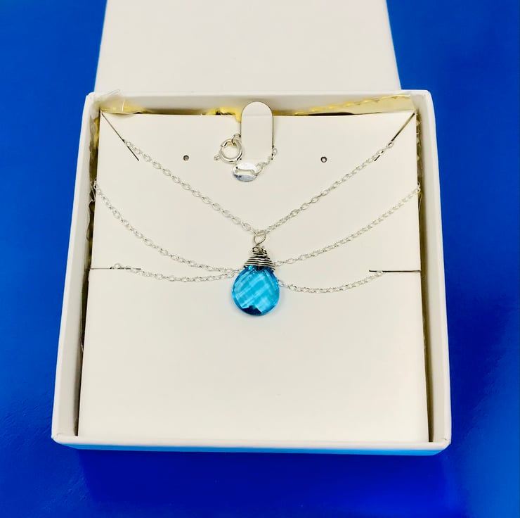 Beautiful blue teardrop quartzin silver wire on delicate chain.