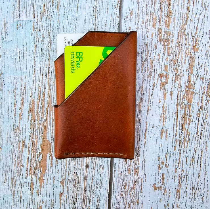 This card wallet features an abstract wrap-around design that is certain to make a statement. Crafted from Walpier Rocky cognac leather, it may initially feel stiff but will naturally soften with use, as is characteristic of full-grain leather. Each wallet is hand crafted to order, and are hand cut, stitched, and finished, resulting in each one being unique. It makes an ideal present for a loved one or as a gift for yourself! All wallets are packaged in padded envelopes, which are both environmentally and letterbox friendly.