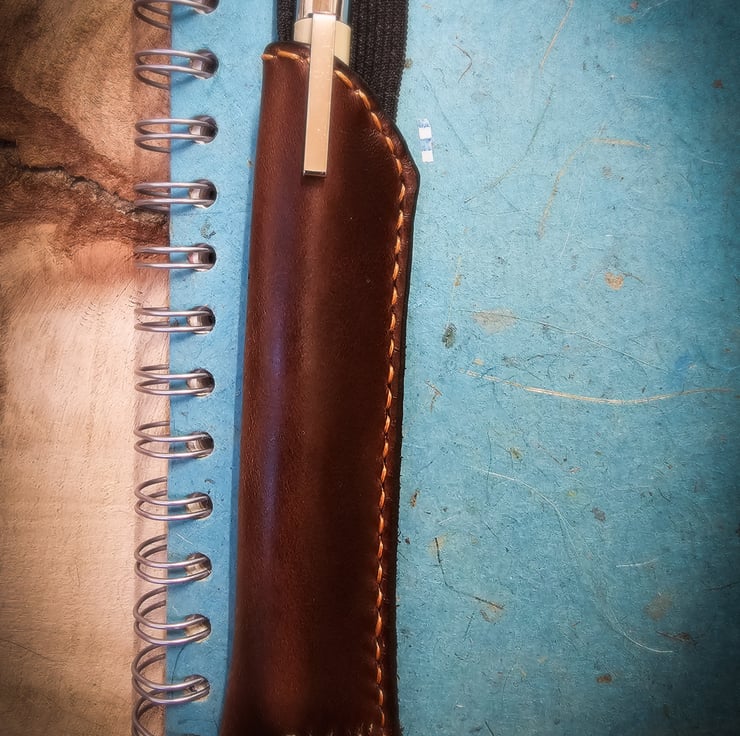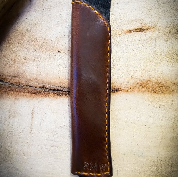Handcrafted Leather Pen Case: This pen case is meticulously crafted by hand, ensuring the utmost quality and attention to detail. This exquisite leather accessory is designed to securely hold your pens, conveniently slipping over the cover of your books or journals. Crafted from premium waxy Hoween Chromexcel leather, this pen case has a real luxury feel and can be personalised with up to three letters or numbers of your choice, making it a truly unique and meaningful gift for a loved one or yourself. This handcrafted pen case not only serves as a practical writing companion but also becomes a cherished keepsake that develops a distinctive patina with time, enhancing its charm and character.